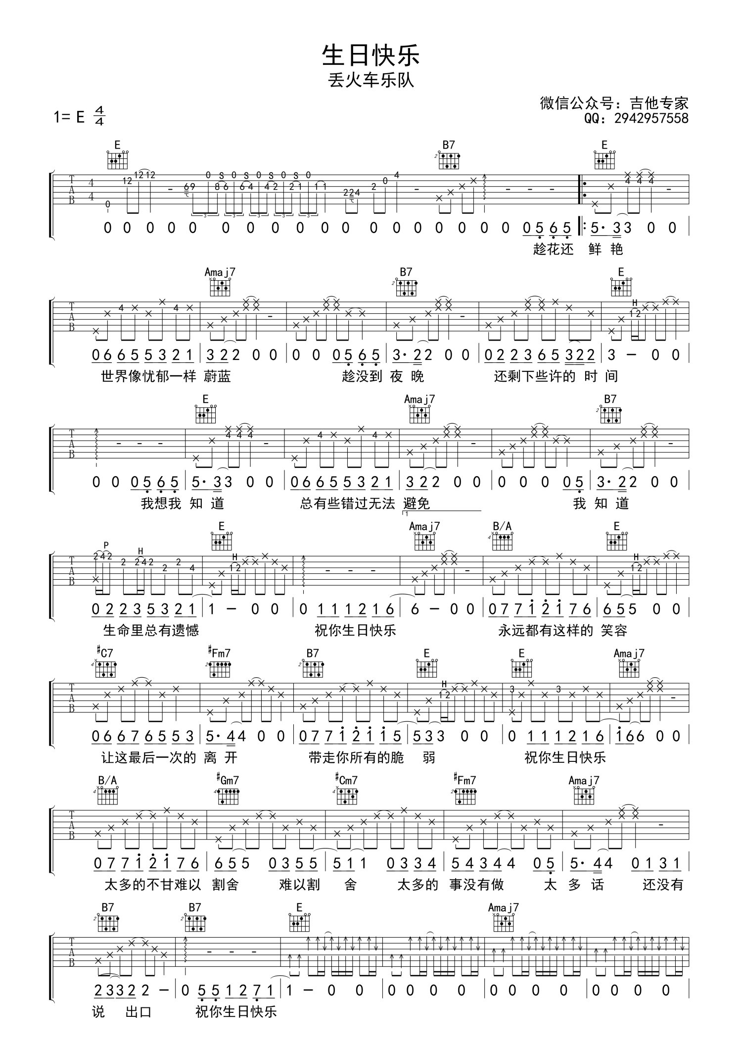 • 生日快乐吉他谱 - 丢火车乐队 - E调吉他弹唱谱第1张