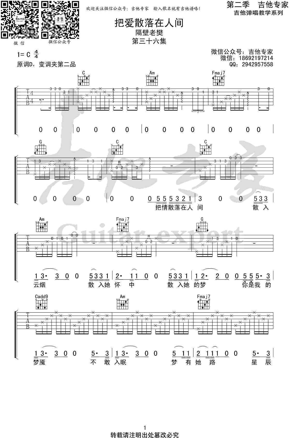 把爱散落在人间吉他谱 - 隔壁老樊 - 吉他弹唱谱
