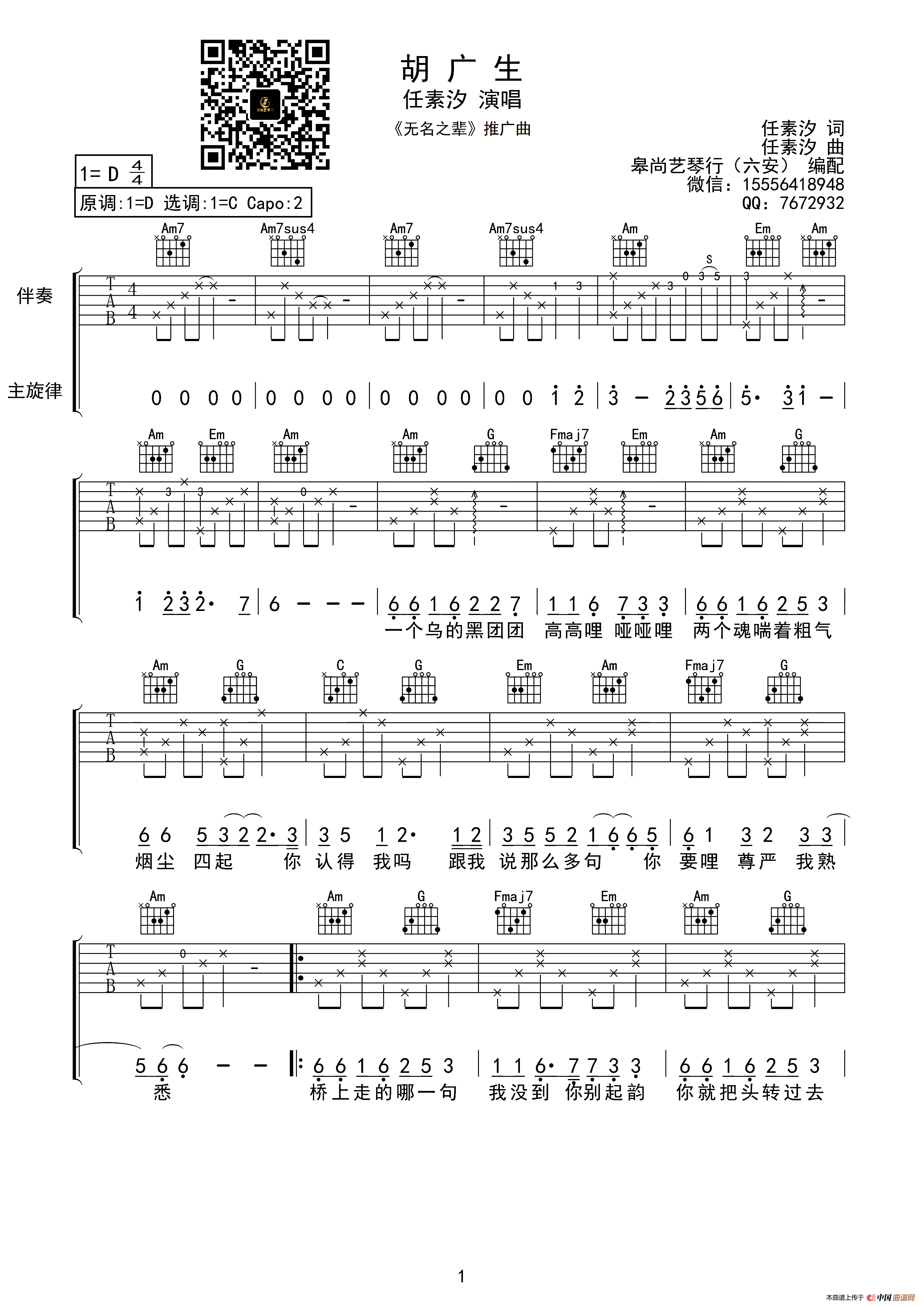 曲谱介绍: 任素汐《胡广生》吉他弹唱谱,共有3张高清图谱。