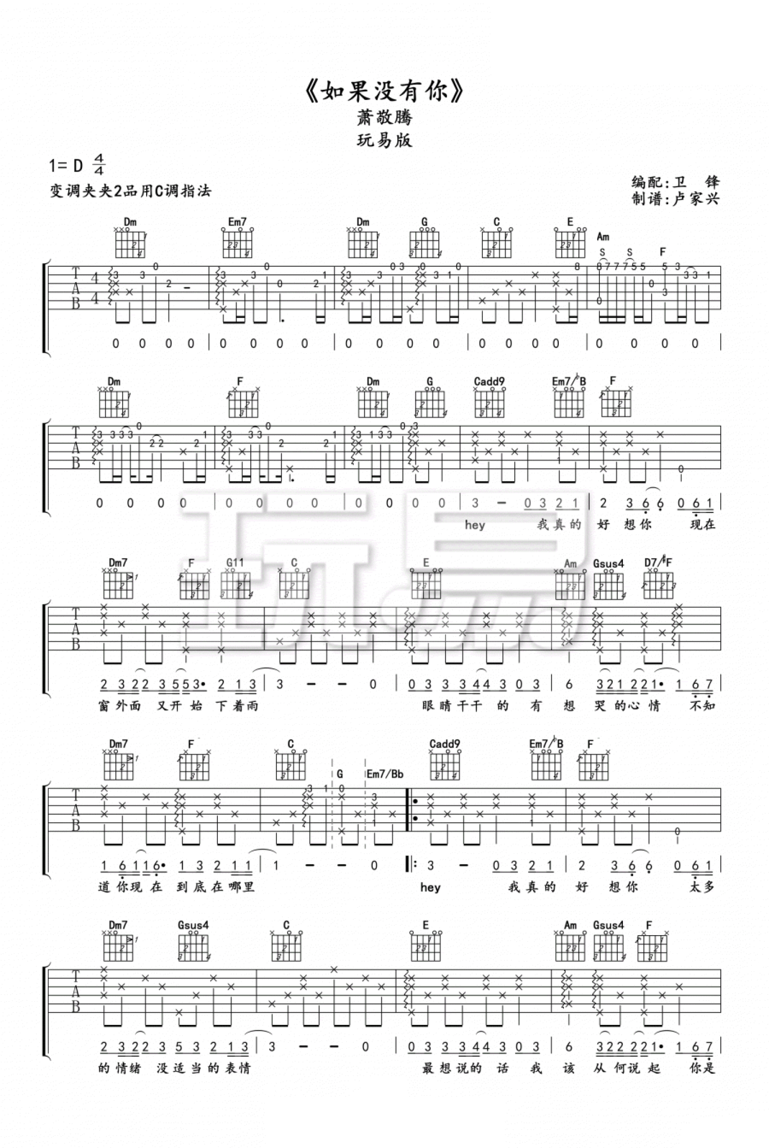 曲谱介绍: 如果没有你吉他谱,萧敬腾版本,原调D,变调夹夹第二品,用C调指法。莫文蔚的原唱,同一首歌唱出的是不同的感觉,有伤感,有无奈,有惆怅,有悲伤,一样的是都唱出了对那个她的思念。一首一个人听很容易就流泪的歌——《如果没有你》,我想应该会有许多人有过这种经历吧,大概这就是别人讲的所谓的有故事的人吧。当然,如果没有你,也不会有伤心。但是,爱情没有如果,任谁都无法重来,这也是我们之所以深信爱情不疑的原因吧,如果没有你,那么多出来的爱,我会留给自己。卫锋老师用细腻的嗓音和感情唱出了属于过去的孤单。适合在宁静的下午,泡上一杯淡淡的茶水,在柔和的阳光里慢慢聆听,有的故事也许只属于你一个人。