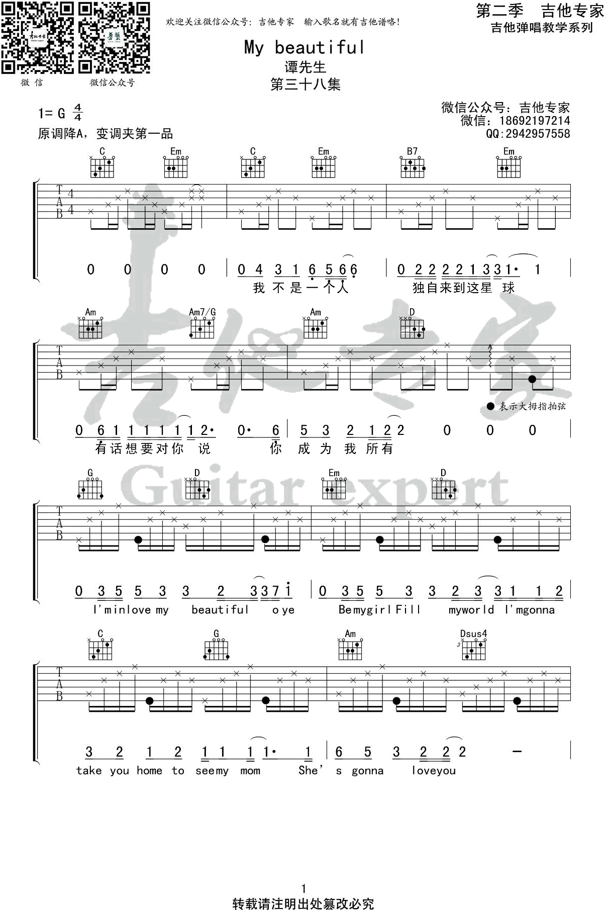 曲谱介绍: 谭先生《My beautiful》吉他谱,网易音乐人DAVIN大文的一首原创歌曲,原调降A,变调夹夹第一品,选用G调指法。My beautiful六线谱,完整版共四张弹唱图片谱。吉他专家编配制谱,更新上传。 祝有人喝了酒,眼睛亮闪闪的跟你讲浪漫和爱。一首很温柔的吉他弹唱歌曲,送给心爱的姑娘,也愿你把自己变得更优秀,更有能力给未来的那个人想要的生活。