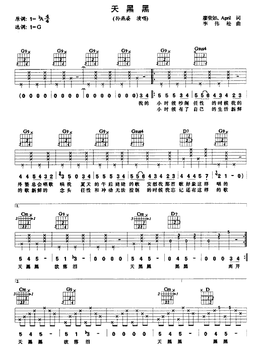 曲谱介绍: 孙燕姿《天黑黑》吉他弹唱谱,共有3张高清图谱。