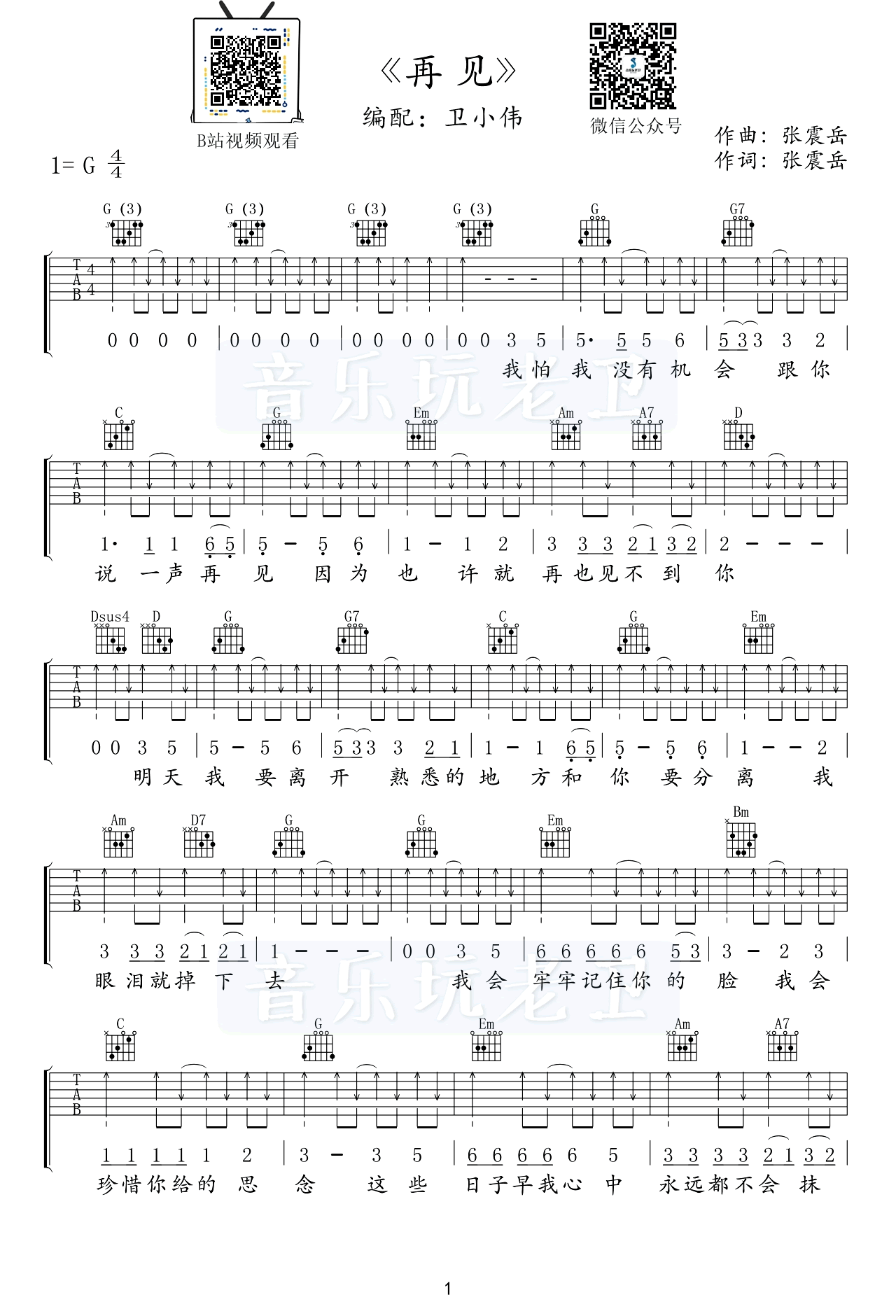 曲谱介绍: 张震岳《再见》吉他谱,G调扫弦版,两张高清图片六线谱,卫小伟编配,并为琴友们带来《再见》吉他弹唱演示和教学视频,整理上传。 一首老歌,带给琴友们,希望烦恼忧愁都散去。整首歌曲不是很难,前奏部分G和弦改成大横按,是为了大家了解和弦的另一种按法,并进行横按的练习。