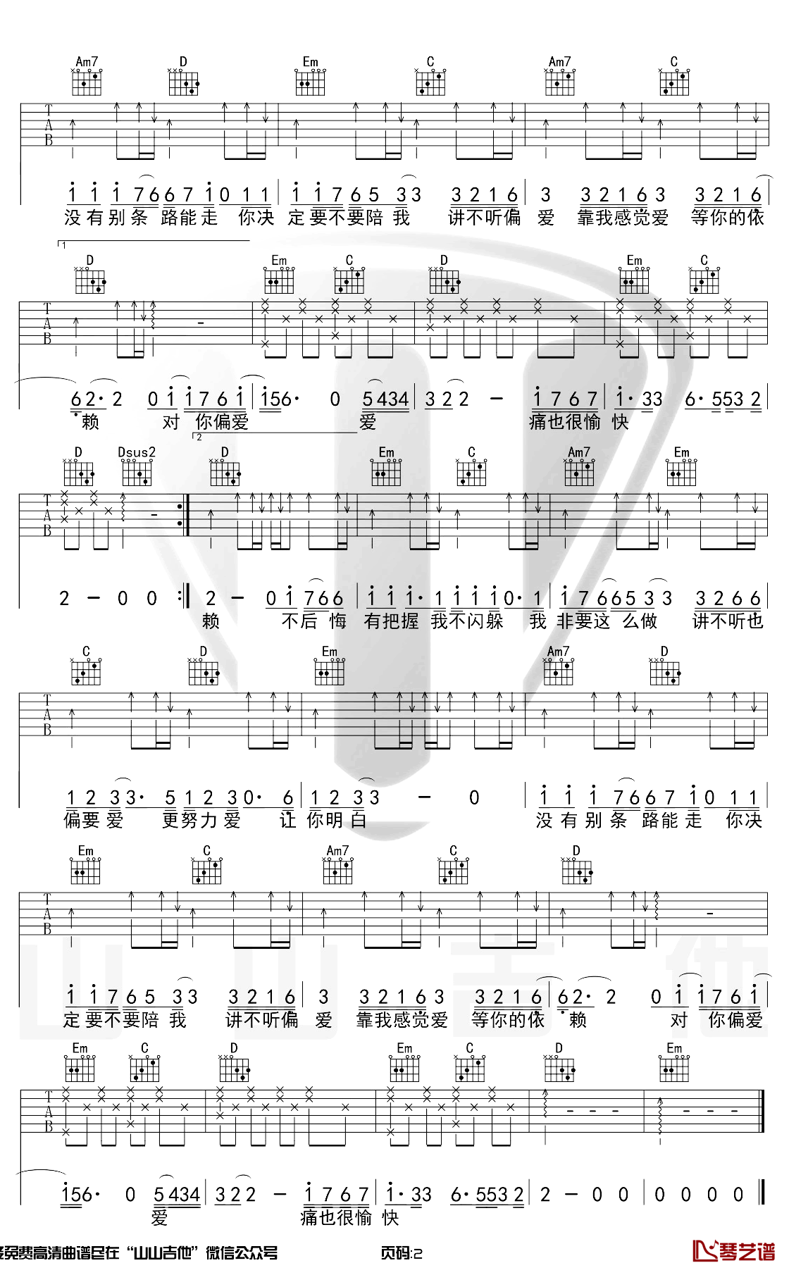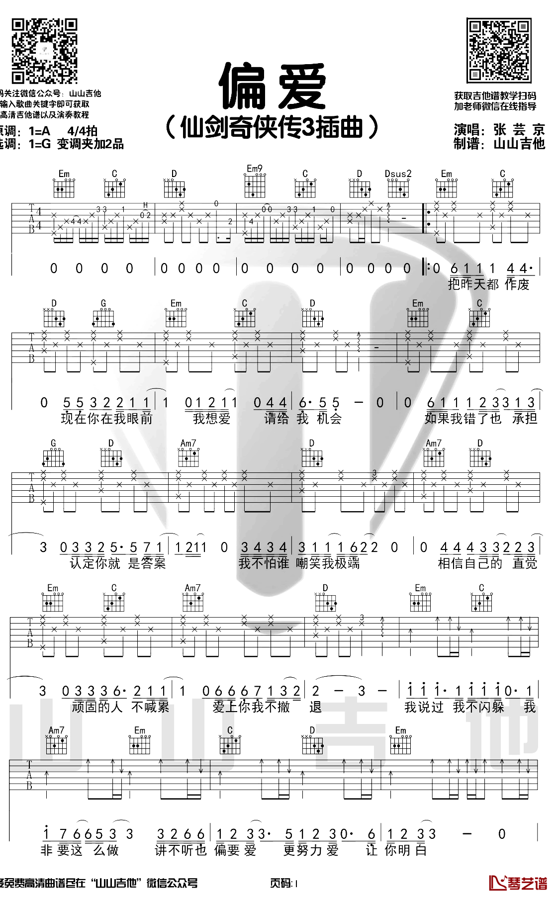 曲谱介绍: 张芸京《偏爱》吉他弹唱谱,采用G调指法编配原版,共有2张高清图谱,免翻页排版设计。