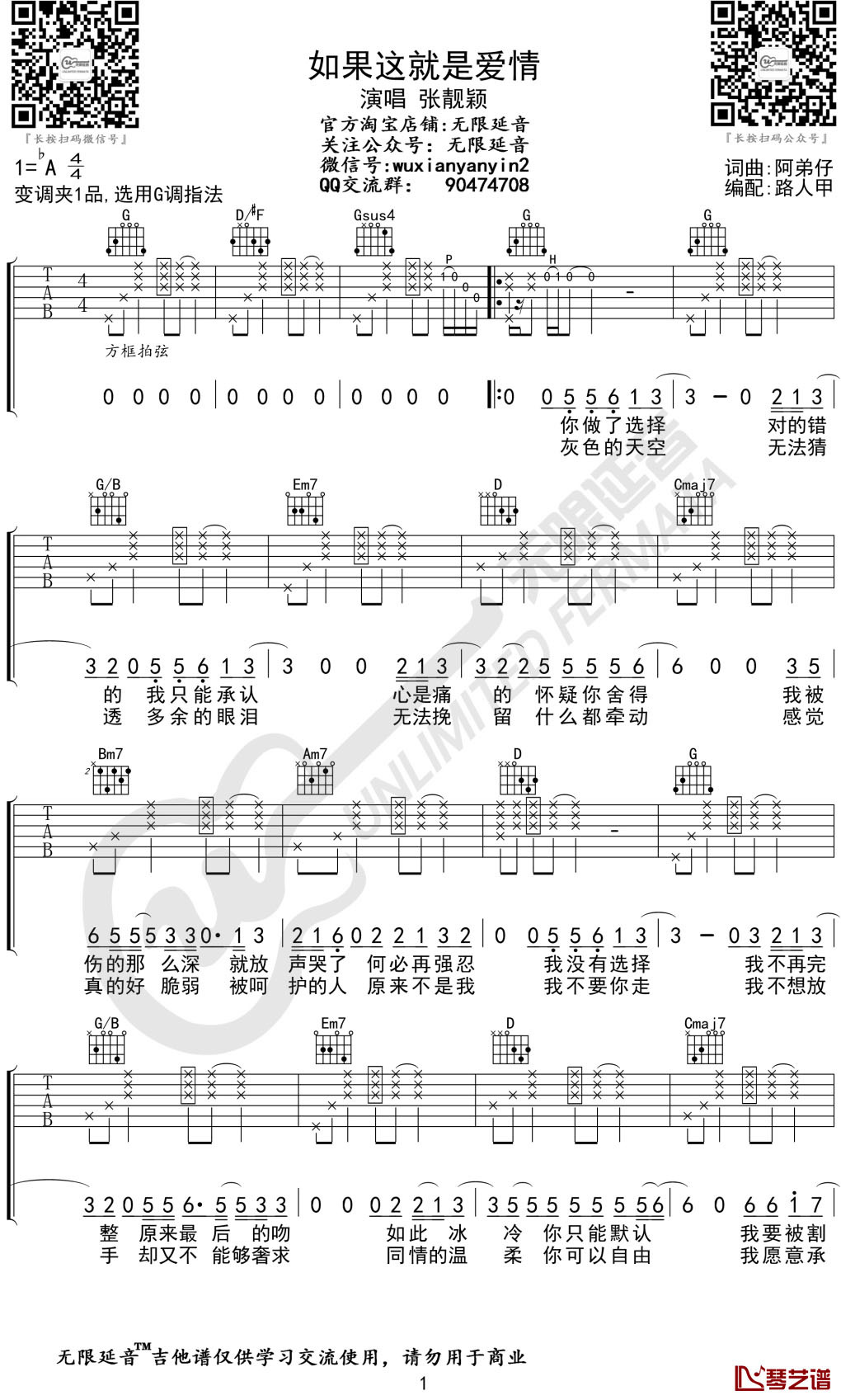 曲谱介绍: 张靓颖《如果这就是爱情》吉他弹唱谱,采用G调指法编配,共有3张高清图谱。