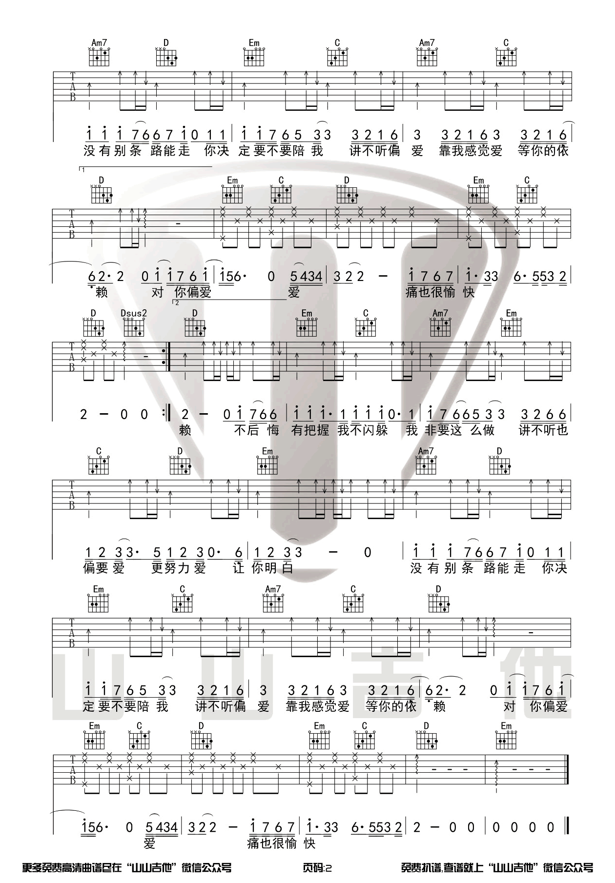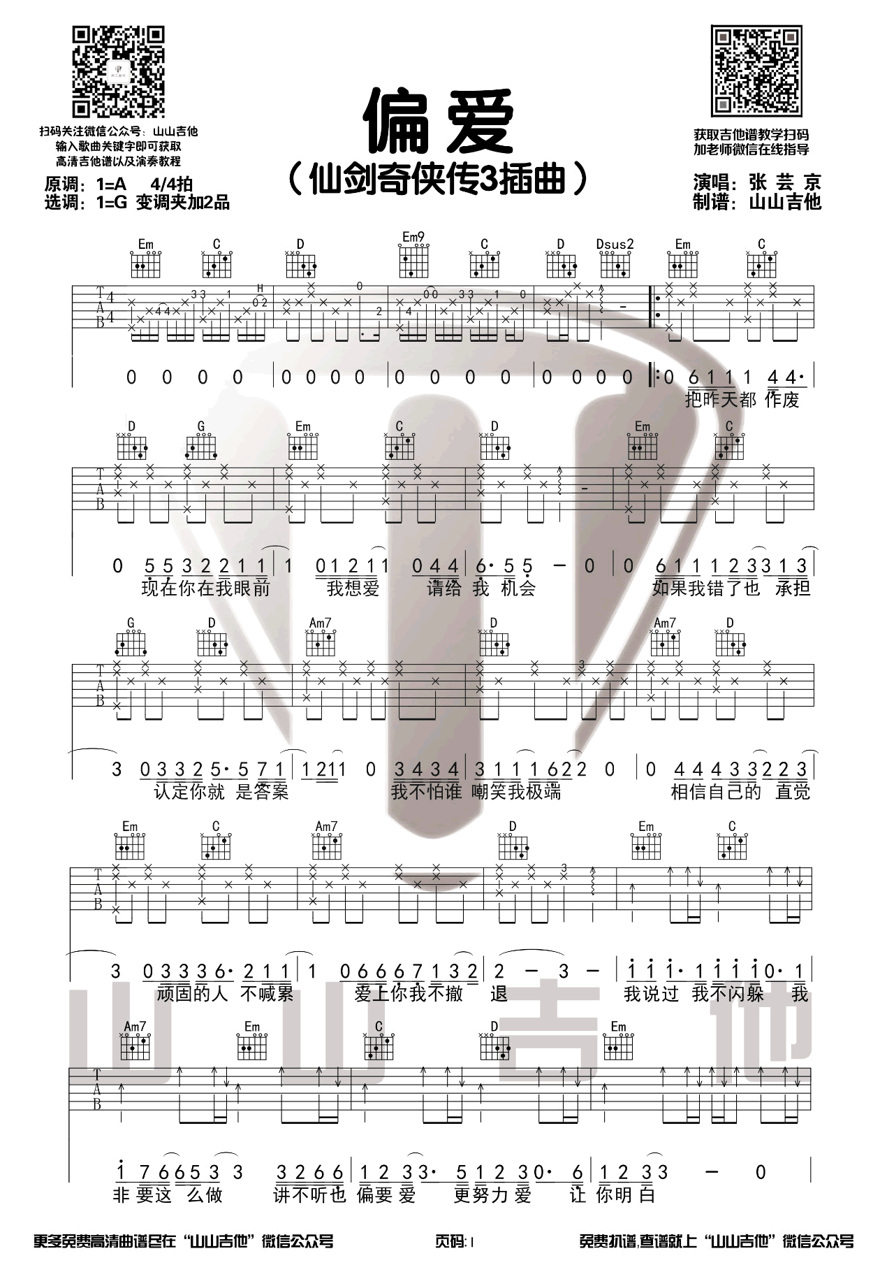 曲谱介绍: 张芸京《偏爱》吉他谱,原调A,选用G调和弦编配,编有简单前奏,变调夹夹第二品。电视剧《仙剑奇侠传3》插曲,偏爱六线谱,两张弹唱图片谱,喜欢这首歌的琴友可以跟着山山老师一起来学习一下,整理上传。 时间拉回到2010年,那年最火热的电视剧当属《仙剑奇侠传3》了,有多少人在紫萱和长卿喝忘情水的那段留下了眼泪,张芸京不仅可以唱出男生低沉的音色还可以用女生清澈的高音爆发力将这首歌表现出来,可以说是非常厉害了,这首歌也成为了当年的年度十大金曲。