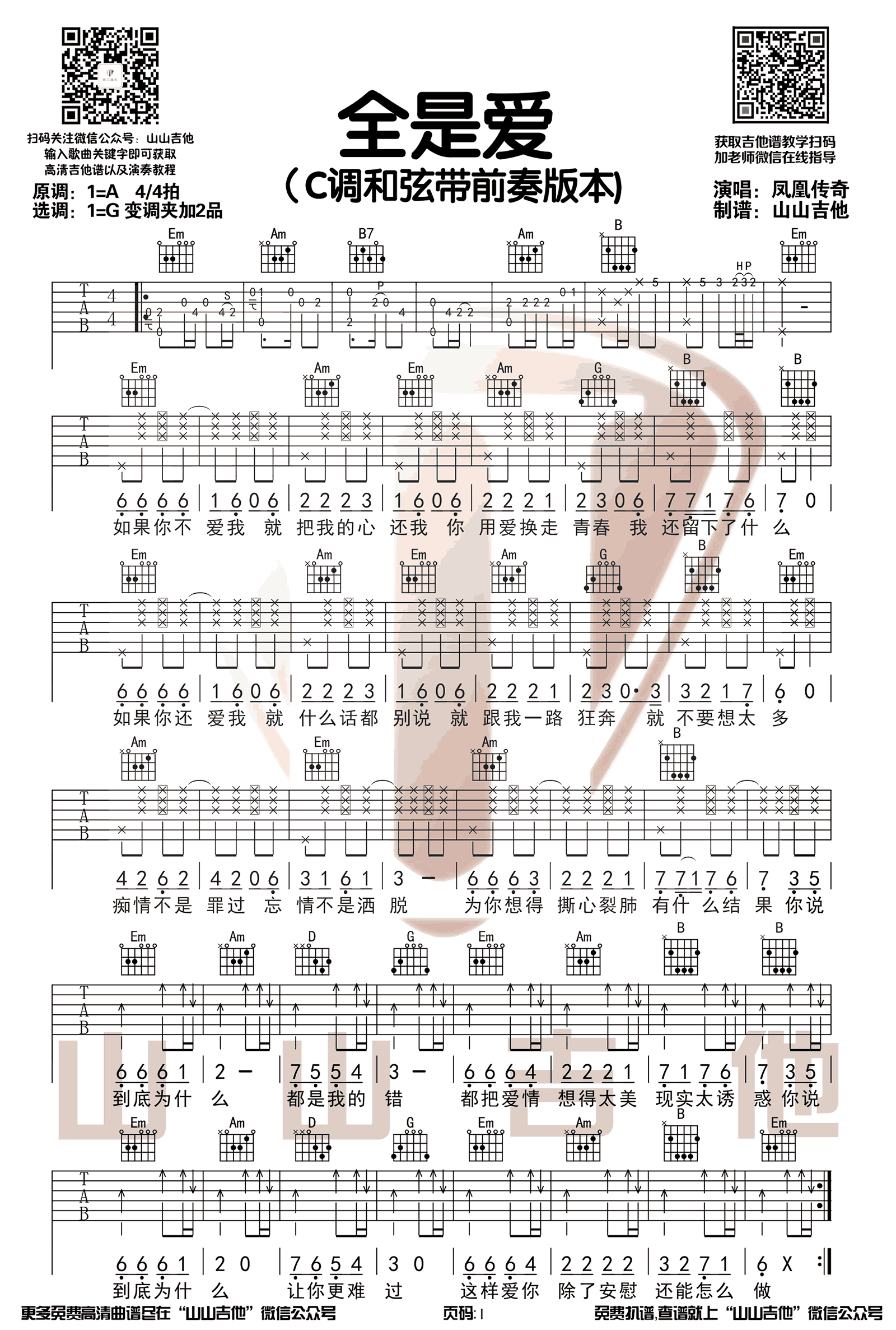 曲谱介绍: 凤凰传奇《全是爱》吉他谱,和弦带前奏版本,全是爱六线谱,要不要买菜的翻唱让这首广场舞神曲又火遍网络。更新上传,山山吉他编配出品。 相较于最炫民族风来说,这首歌算好的了,我们编配了带前奏的吉他谱,由于歌曲后半部分是RAP(主要是很长),所以并没有加入到吉他谱当中,山山老师也是给照例给大家录制了吉他谱的演示视频!