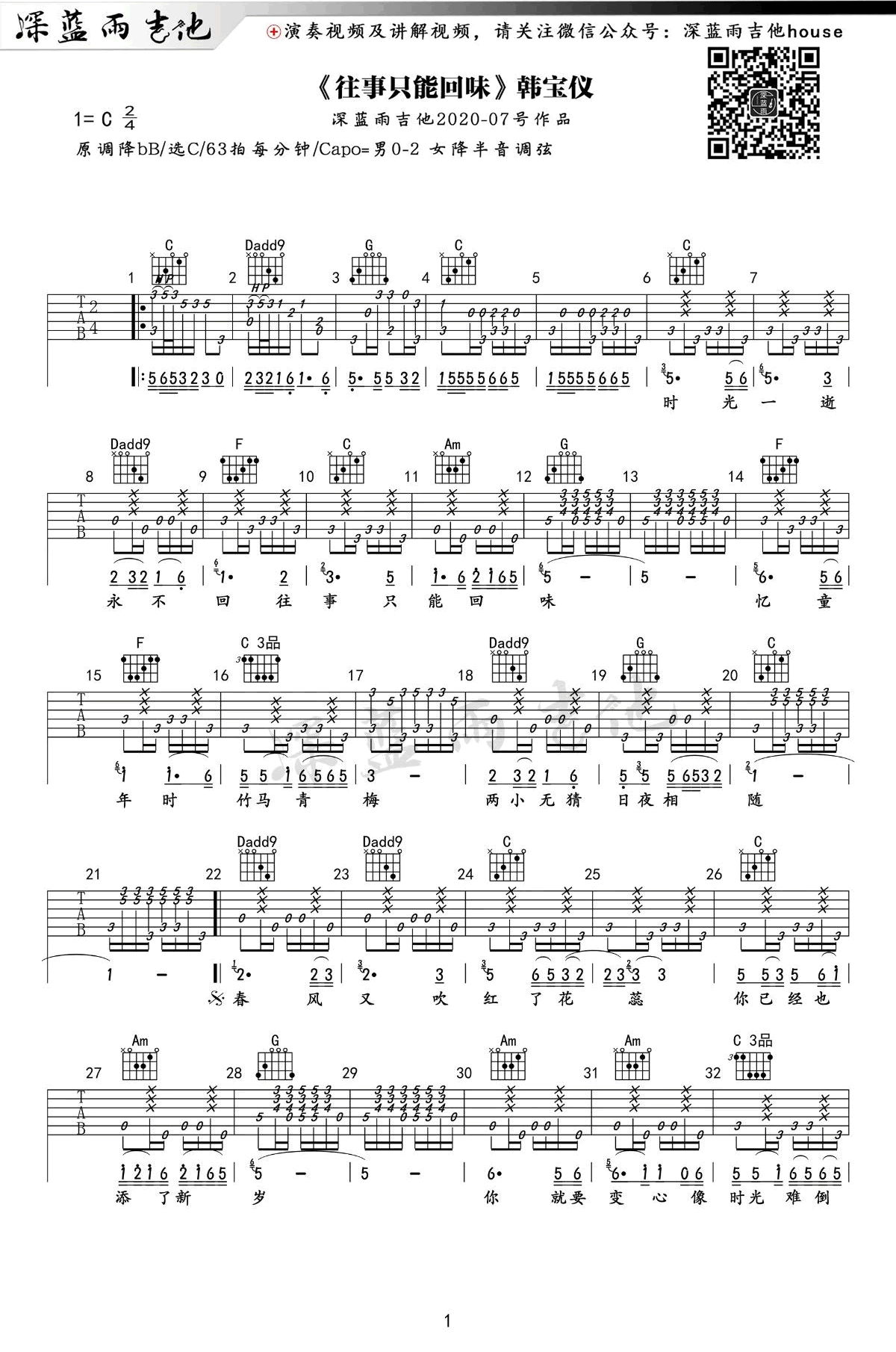 曲谱介绍: 《往事只能回味》吉他谱,韩宝仪演唱的一首华语流行经典歌曲,往事只能回味六线谱,原调降B,选用C调指法,变调夹建议男生0-2品,女生降半音调弦。91吉他谱吉他出品,推荐收藏。随谱附上老师为琴友们带来的《往事只能回味》吉他弹唱视频,同学们参照示范演示练习。 七八十年代的老歌,熟悉的旋律,把我们带到过往的回忆中,难忘两小无猜的青梅竹马,难忘春风吹红的花蕊,美的仿佛一幅永恒的让人心醉画卷。