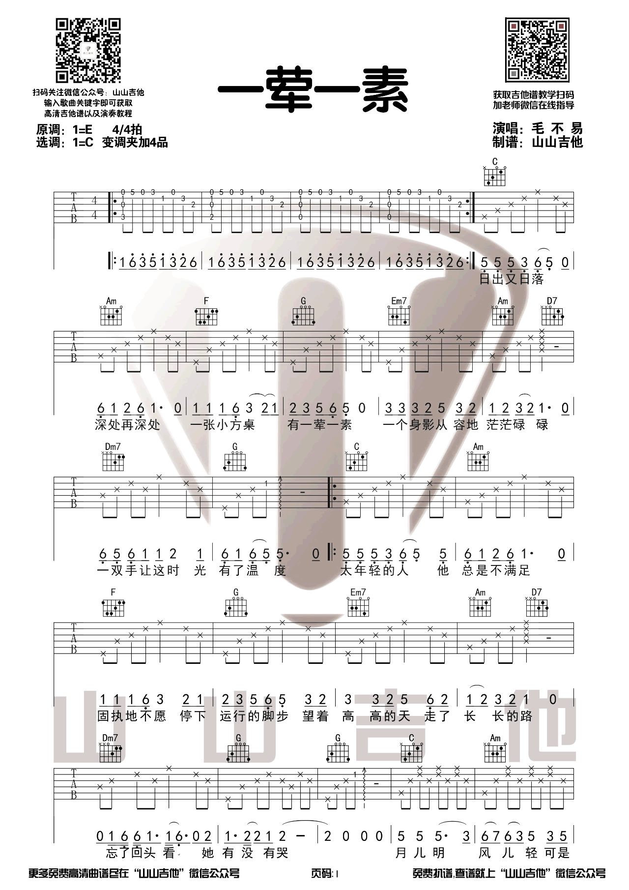 曲谱介绍: 一荤一素吉他谱,毛不易演唱,原调E选调C,变调夹夹第四品。一荤一素六线谱,两张弹唱图片谱,山山吉他出品,吉他谱更新上传。 这是毛不易为怀念母亲创作的一首感人的歌曲,人世间平凡人生不过是母亲最温暖的嘱托与牵挂。曲谱适合新手练习,喜欢这首歌的同学们跟着山山老师的演示视频一起练起来吧~