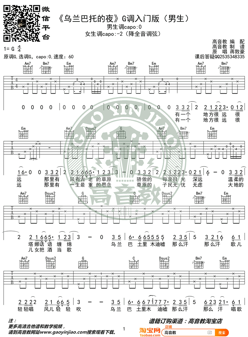 曲谱介绍: 《乌兰巴托的夜》吉他谱,蒋敦豪中国好声音演唱,G调指法编配,入门男生版,女生需要降全音调弦。高音教出品,随谱附上猴哥老师带给琴友们的《乌兰巴托的夜》吉他弹唱和教学视频,整理上传。 这首传唱度极高在蒙古国家喻户晓的经典民谣,唱出对故乡至深的思念,温暖又催人泪下,我爱这种静谧的深沉!