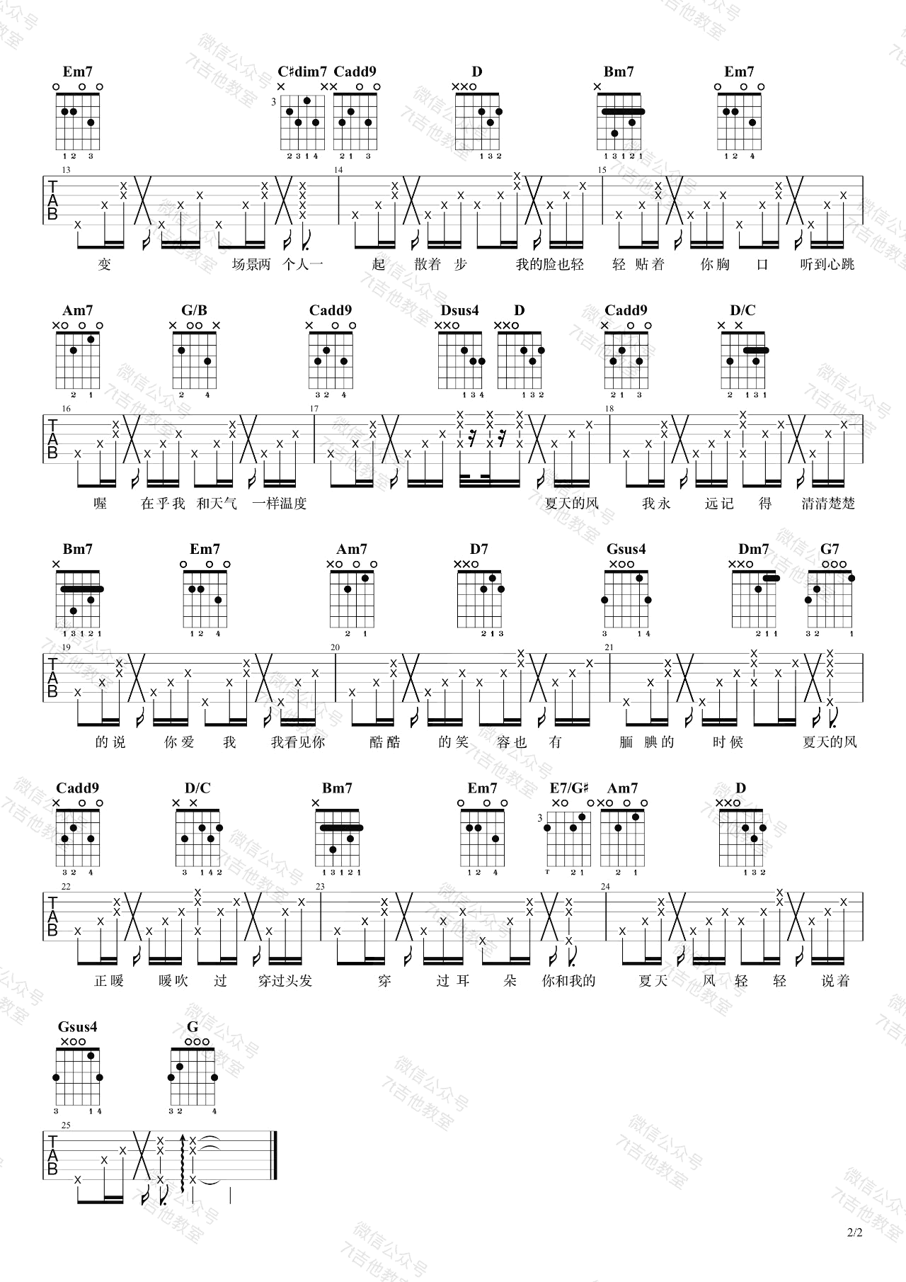 曲谱介绍: 温岚《夏天的风》吉他谱,这首歌的原调是D大调,采用的是G大调的指法来编配,视频里是降半音调弦,没有使用变调夹,适合音域较低的男生~想唱原调的同学需要用标准音调弦,变调夹夹在第7品。感谢7T吉他教室编配,上传更新。 右手节奏型部分琴友们可自由发挥,有很多种节奏型都能把同一首歌弹得很好听,不必完全拘泥于曲谱,特别是初学爱好者,可以用最简单基础的节奏型来演奏。