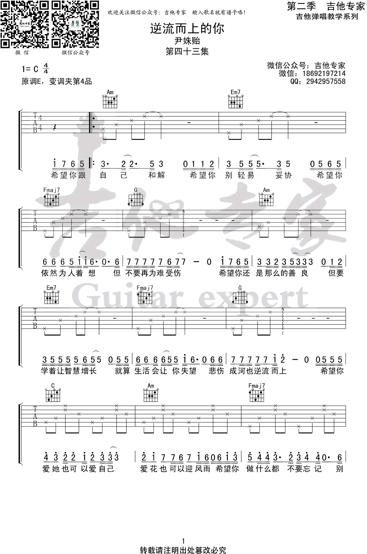 曲谱介绍: 《逆流而上的你》吉他谱,编配的挺简单,尹姝贻词曲演唱,电视剧《逆流而上的你》片尾主题曲。歌曲原调E,选用C调指法,变调夹夹第四品。吉他专家制谱分享,整理更新。 简单的旋律,朴实的歌词,却有一种温柔动人的能量,给身处逆境中的人们以鼓励。漫漫人生路,从来不是只有一帆风顺,但愿遇到瓶颈时,每一个人,都能够坚持自我,逆流而上。