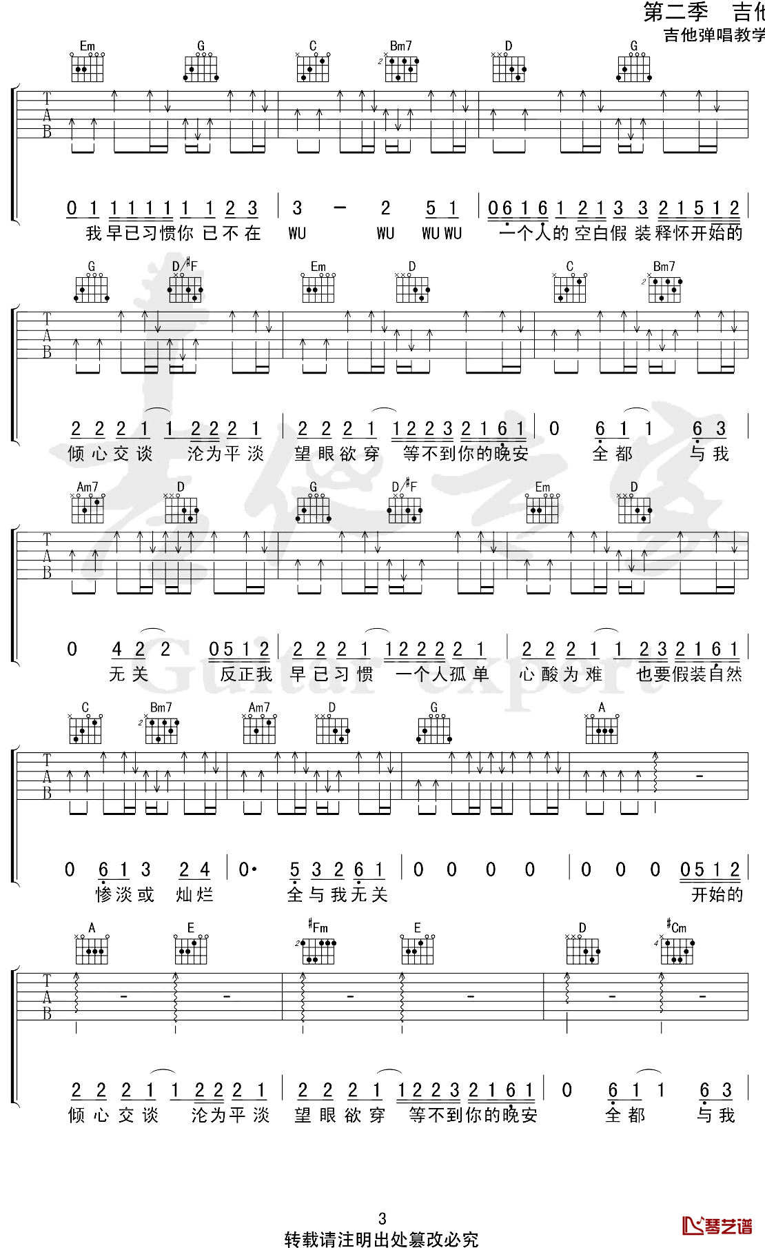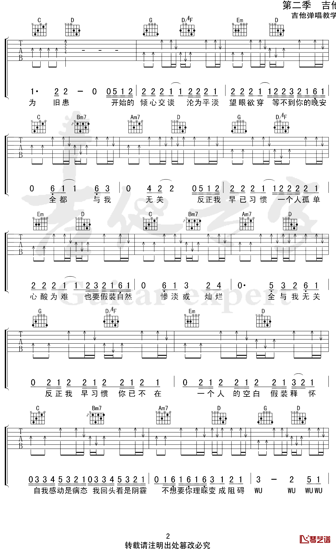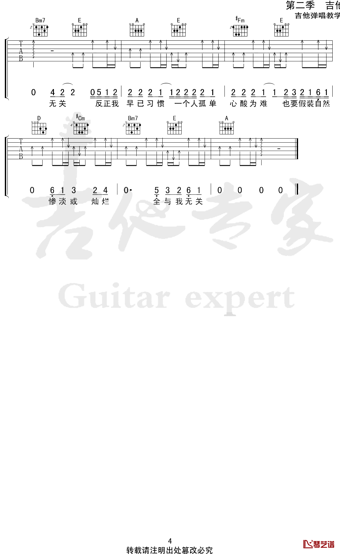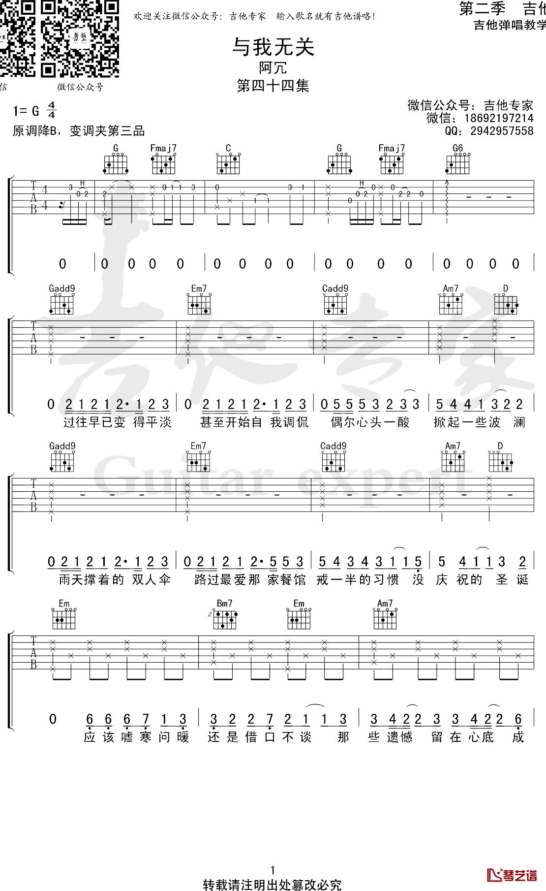 曲谱介绍: 阿冗《与我无关》吉他弹唱谱,采用G调指法编配,共有4张高清图谱。