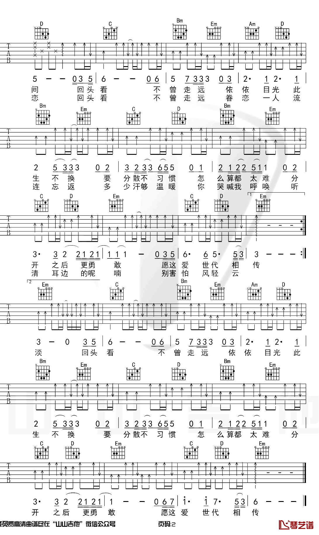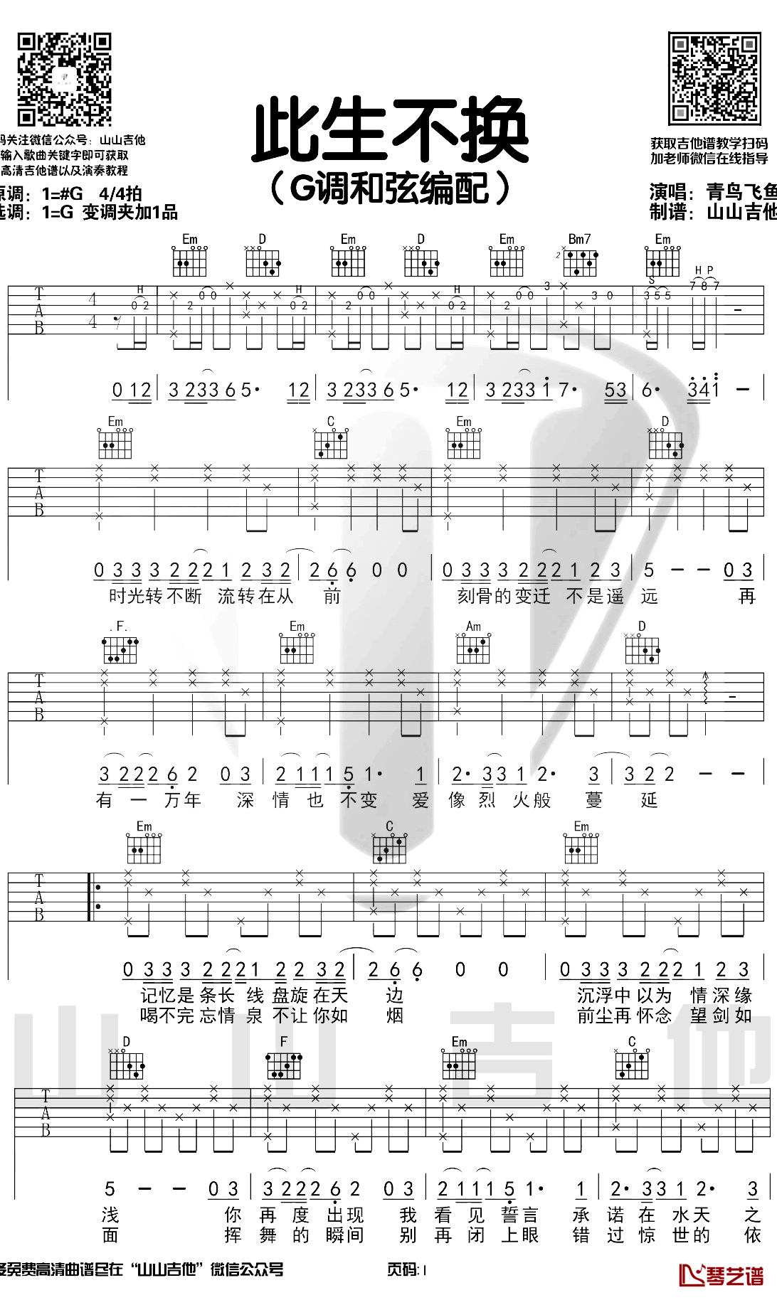 曲谱介绍: 青鸟飞鱼《此生不换》吉他弹唱谱,采用G调指法编配,共有2张高清图谱,免翻页排版设计。