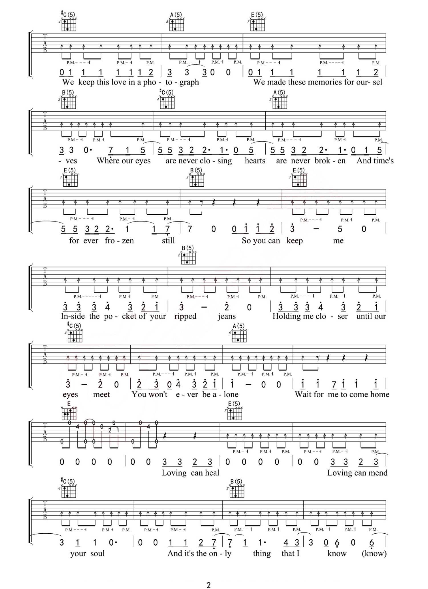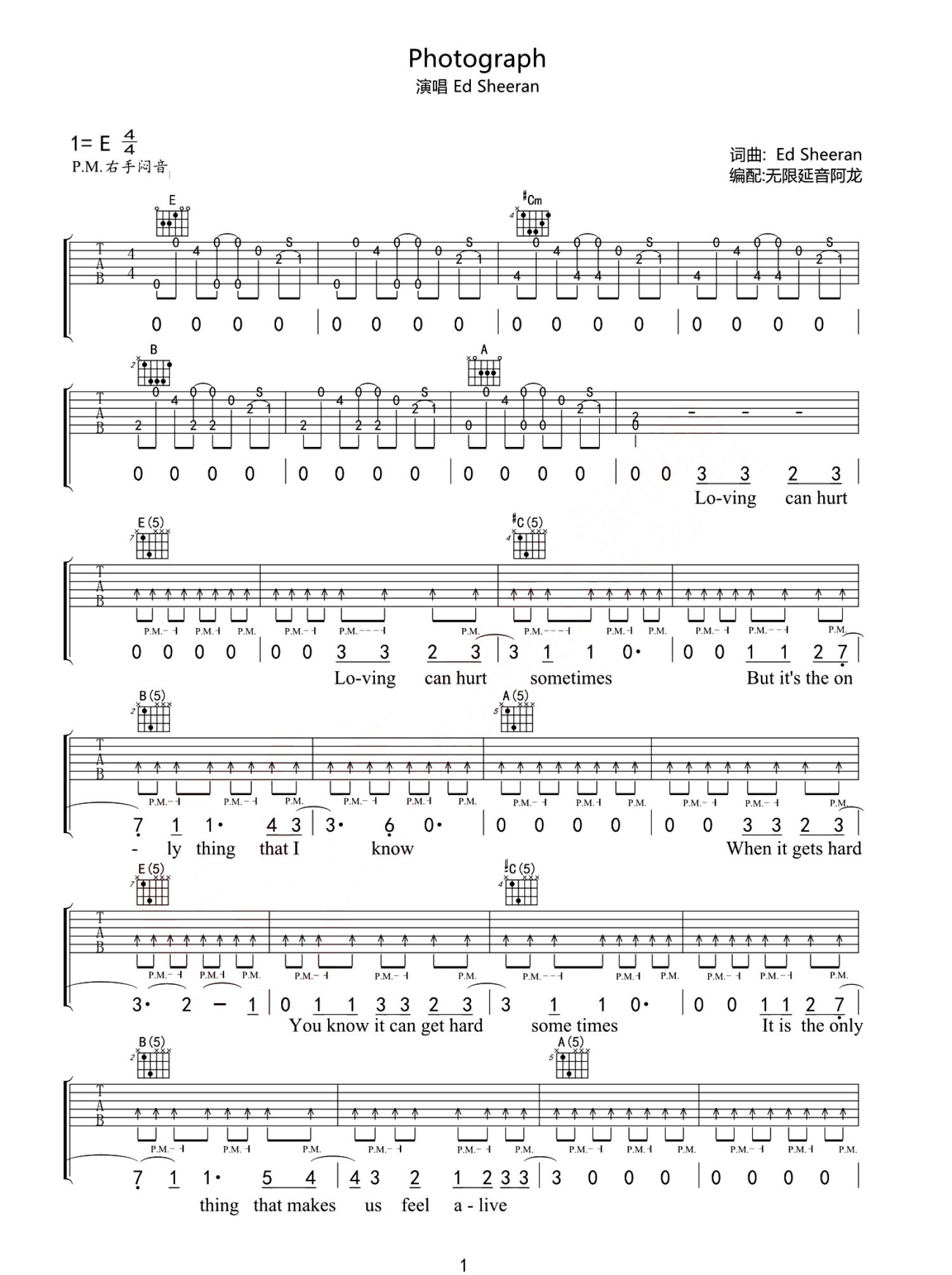 曲谱介绍: 《Photograph》吉他谱_Ed sheeran_E调原版弹唱谱_高清六线谱分享,《Photograph》是由英国流行男歌手Ed Sheeran演唱的一首歌,爱,是不管何时我们拥有的唯一的东西。它有时会伤害你,有时候会让你伤到别人;但是你知道,一张张泛黄的相片背后,总会有一个人等着回家。 这里采用E调指法根据原版进行编配,曲谱和弦及指法有些复杂,另外加入了闷音技巧,所以在练习时可能会有一定难度。