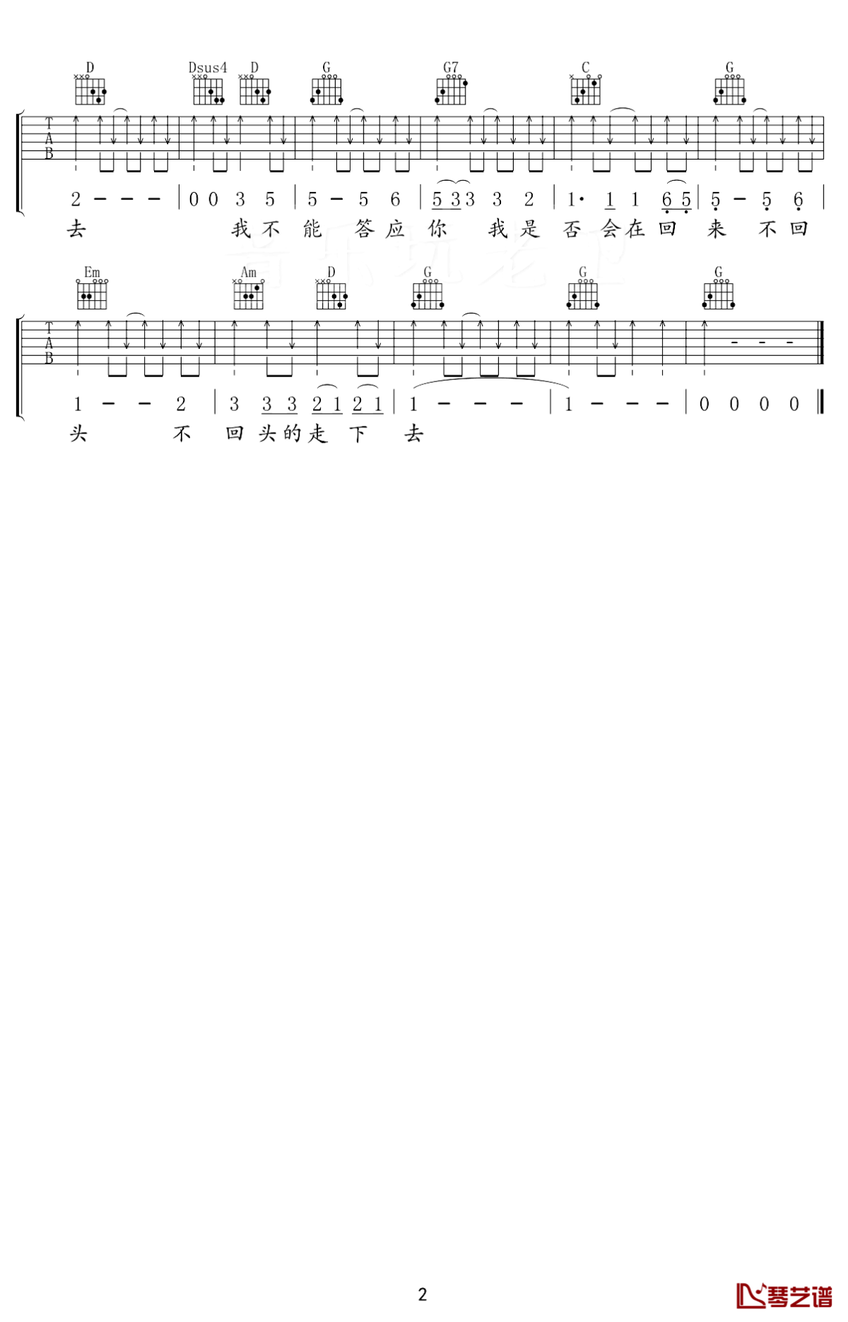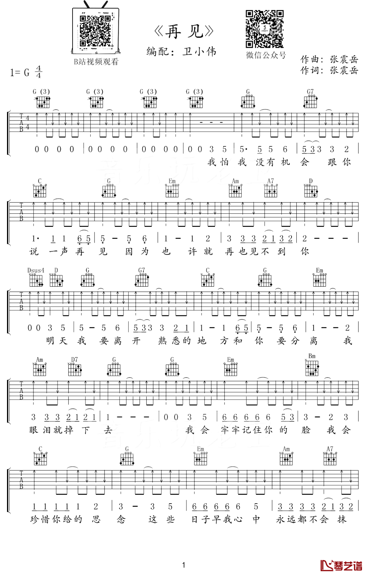 曲谱介绍: 张震岳《再见》吉他弹唱谱,采用G调指法编配,共有2张高清图谱,免翻页排版设计。