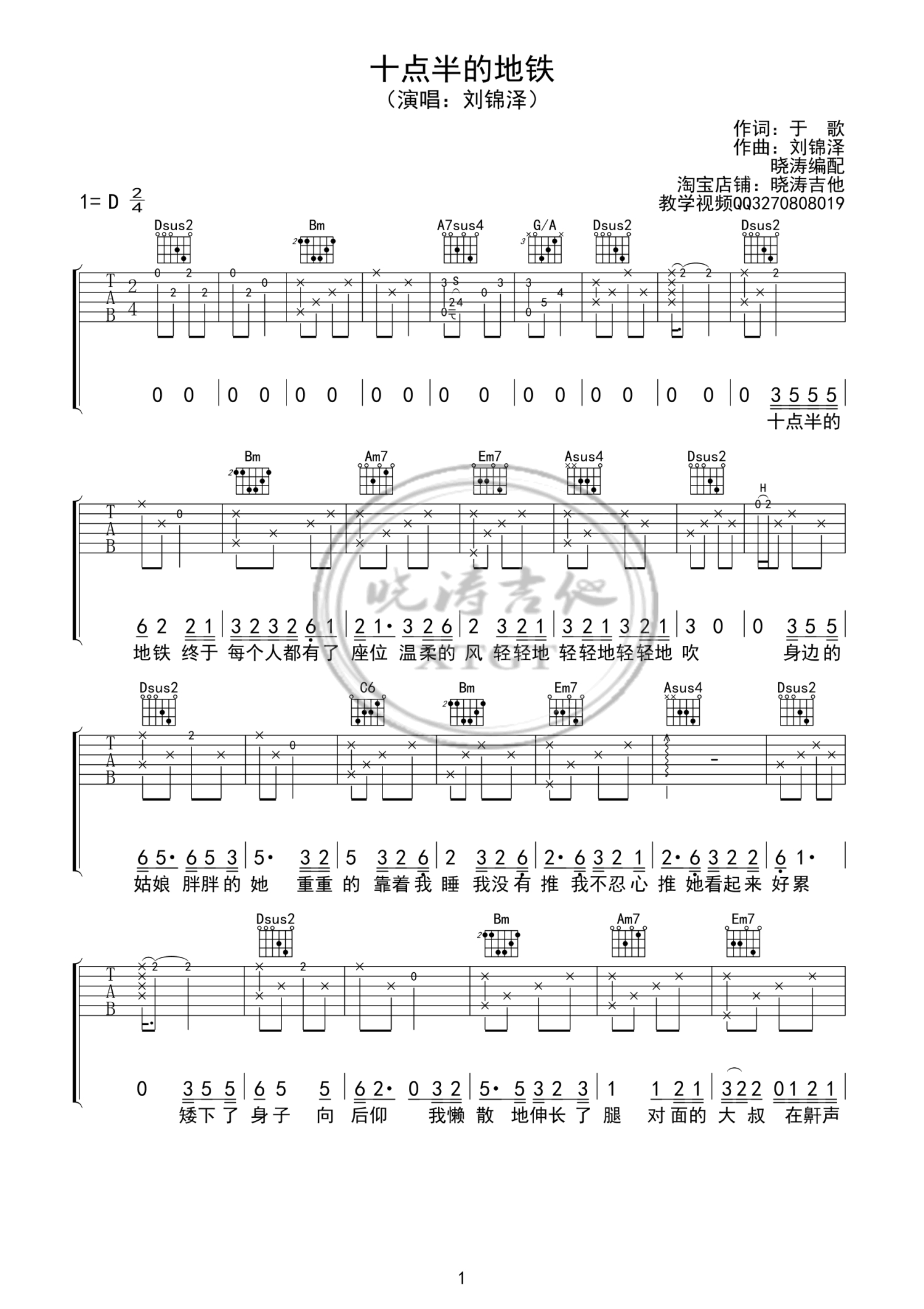 十点半的地铁吉他谱 - 刘锦泽 - D调吉他弹唱谱