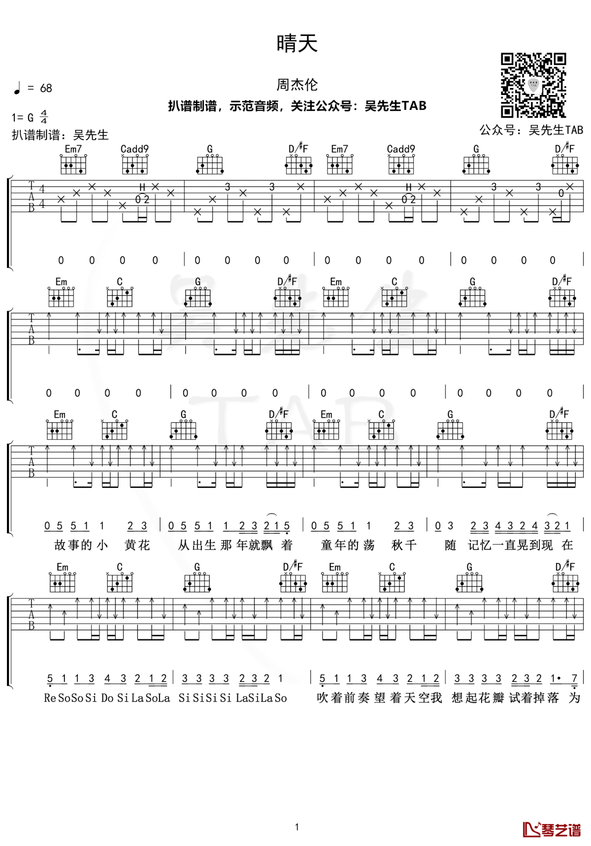 曲谱介绍: 周杰伦《晴天》吉他弹唱谱,采用G调指法编配,共有3张高清图谱。