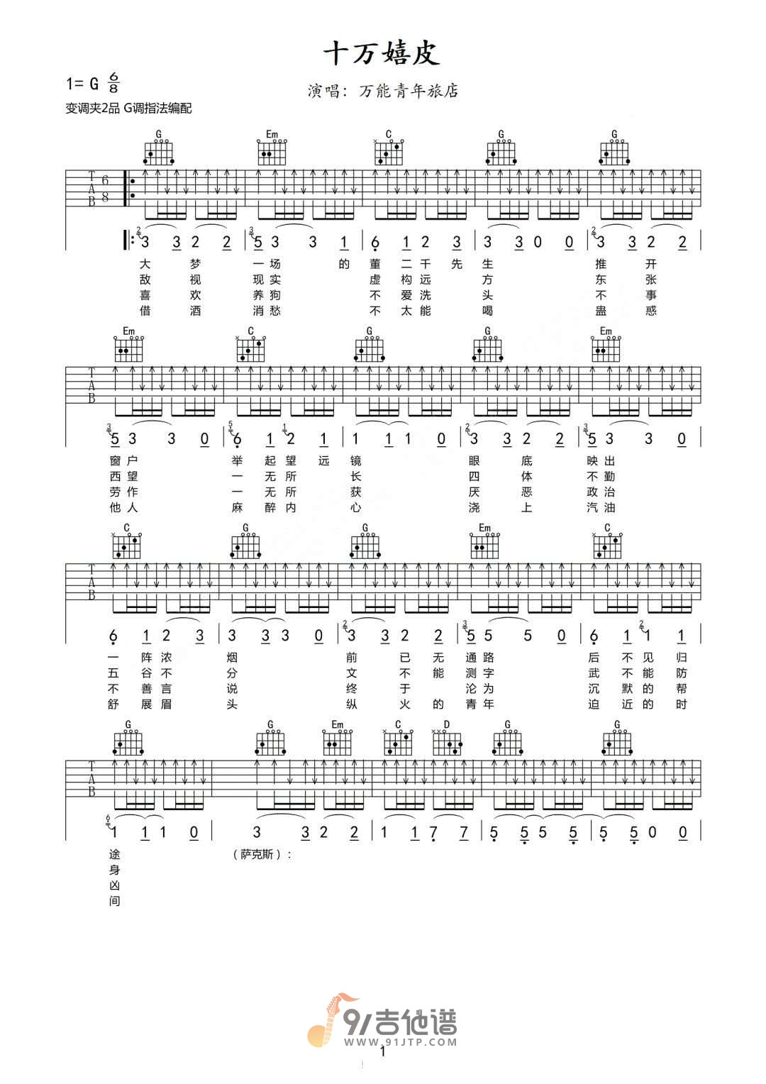 十万嬉皮吉他谱 - 万能青年旅店 - G调吉他弹唱谱 - 原版
