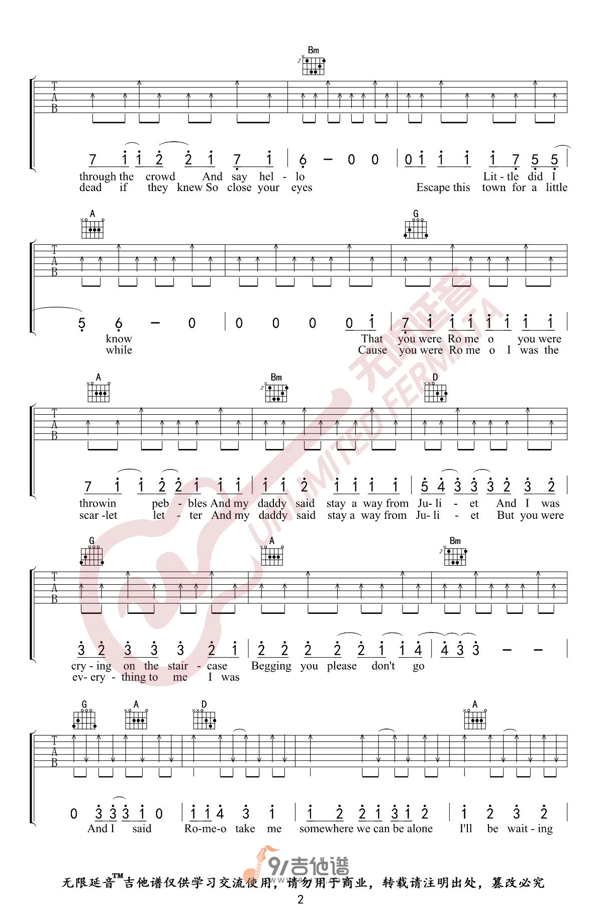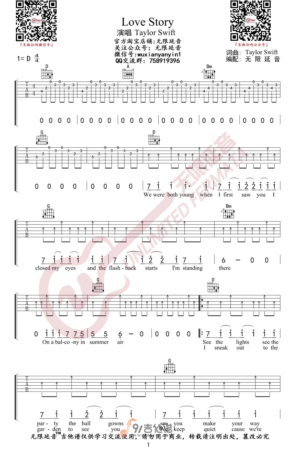 曲谱介绍: 曲谱简介:Love-Story吉他谱,Taylor-Swift演唱的一首歌曲,4/4拍的节奏,这首歌曲的原调为D调,这里曲谱采用了D调指法进行编配,演唱时可不夹变调夹,曲谱由无限延音编配出品。能够取“爱情故事”这个如此大胆直白的歌名真的需要勇气,但是Taylor这首突破性的单曲在“故事”这方面做得很好,她借此隐喻一段现代的爱情故事,但却能把控有度,不会变得矫情。