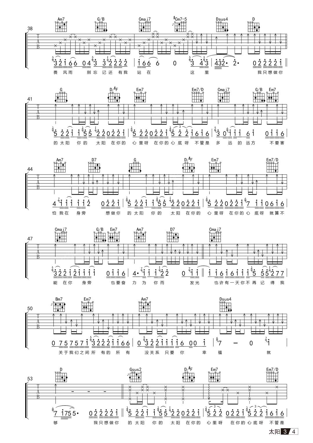 曲谱介绍: 吉他谱介绍:太阳吉他谱,王巨星演唱的一首歌曲,4/4拍的节奏,这首歌曲的原调为B调,这里曲谱采用了G调指法进行编配,演唱时夹变调夹4品可回到原调,也可根据个人实际嗓音情况选择。曲谱由琴谱网更新上传,共4张高清图片弹唱吉他谱例,来源于@杨鑫编配出品。生活中你也许会感到失望,也许会对人生感到迷茫。但总会有一个人,如同你心底的太阳一样,照亮你的心房,照尽你的不安和彷徨。那颗太阳,无论发生什么都陪在你身边,即使相隔遥远也默默为你发光。