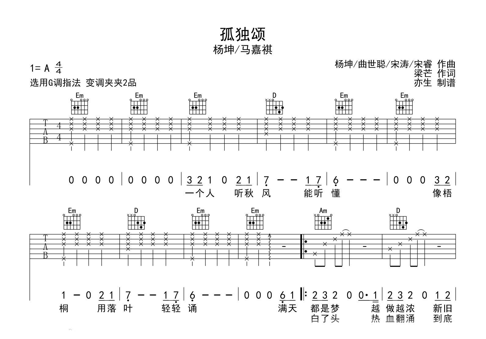 孤独颂吉他谱 - 杨坤/马嘉祺 - G调吉他弹唱谱