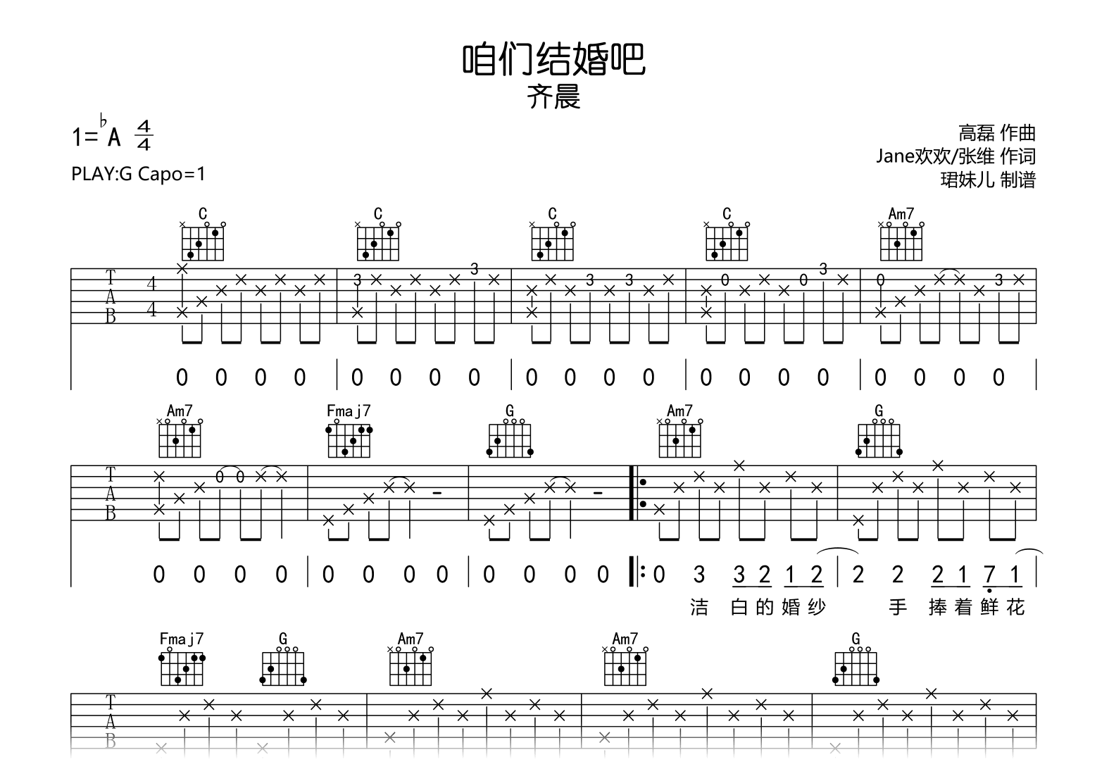曲谱介绍: 咱们结婚吧吉他谱,齐晨演唱,《咱们结婚吧》吉他六线谱,原调bA,采用G调指法编配,建议变调夹1品,演奏速度85BPM,难度较简单易上手。