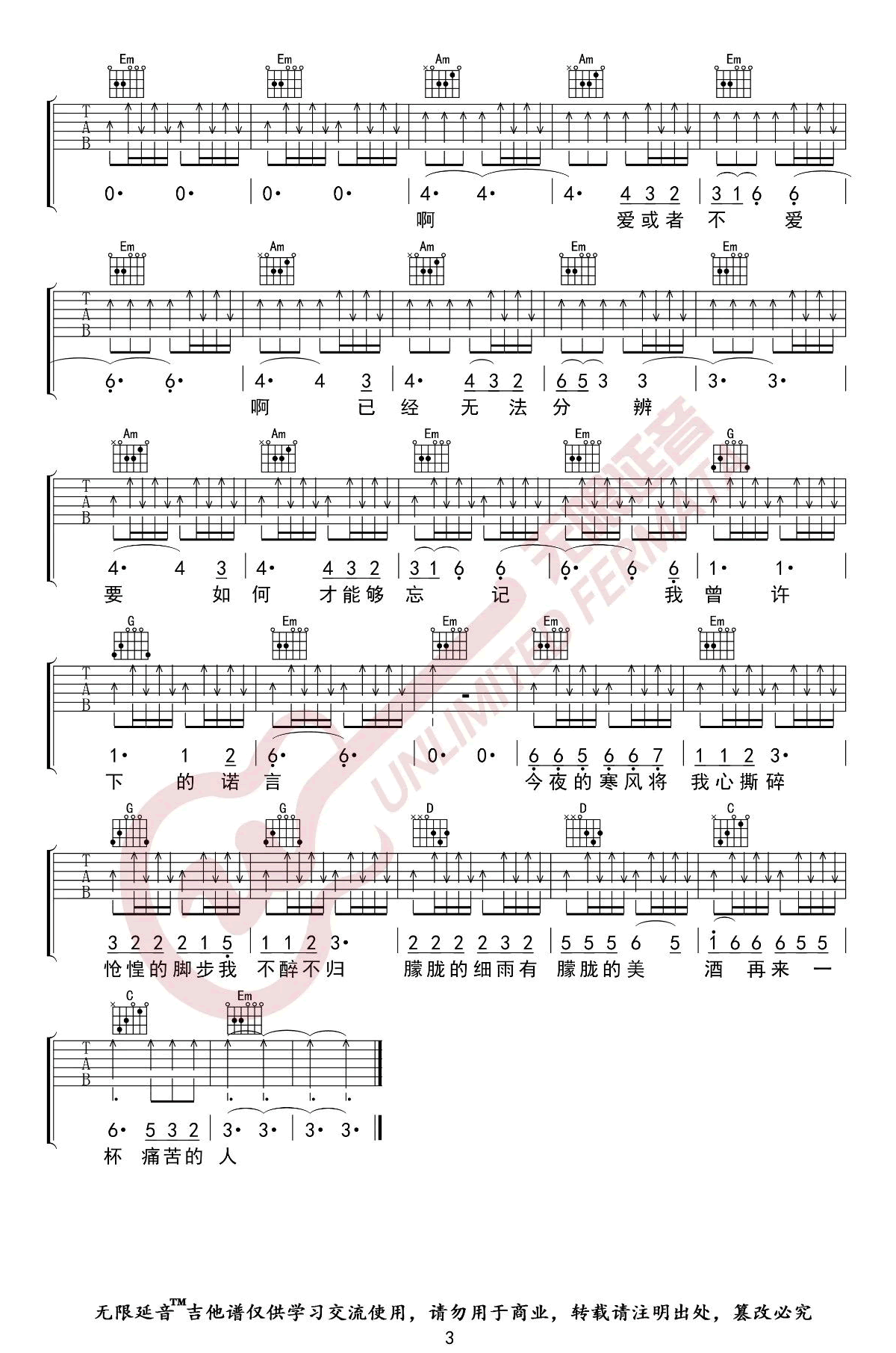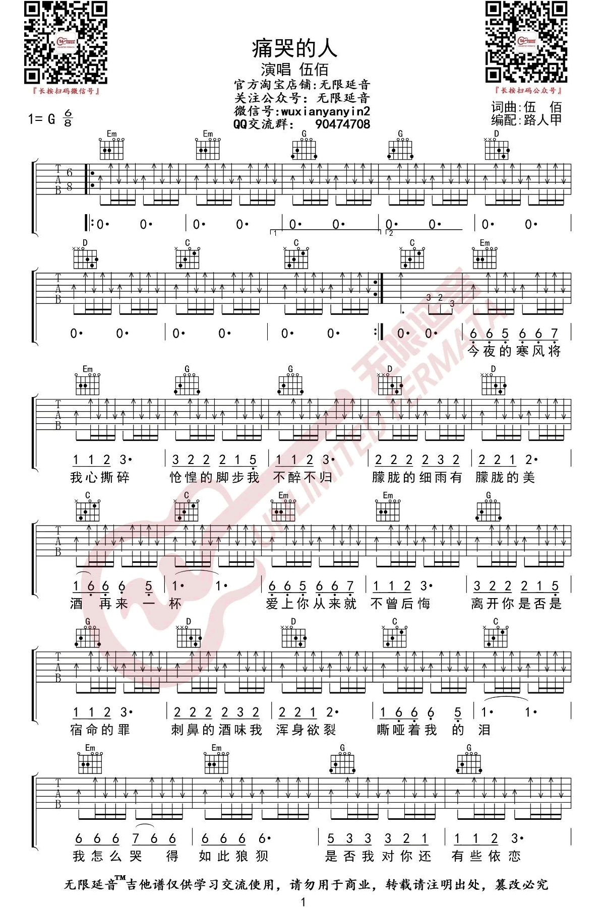 曲谱介绍: 《痛哭的人》吉他谱,伍佰演唱的一首经典伤感情歌。痛哭的人六线谱,G调指法弹唱谱,三张图片谱例,无限延音编配出品,整理上传。 悲情失意的痛苦,沙哑狂野的歌声,让我们深切感受到失恋的失落和悲伤,听伍佰的歌,我们会在嘶吼中感到释放,会沉迷于浪子的音乐里无法自拔。