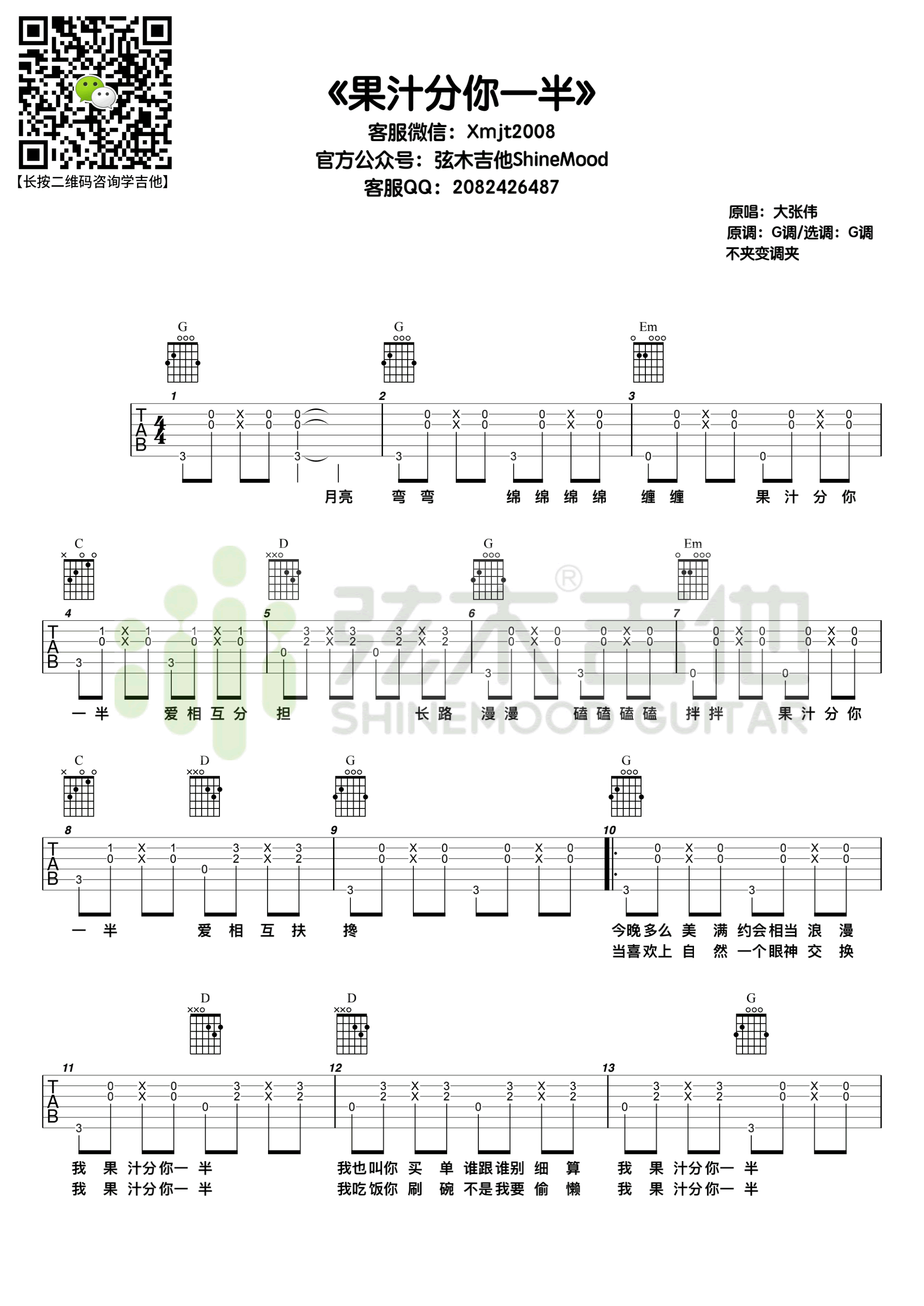 曲谱介绍: 花儿乐队《果汁分你一半》吉他谱,G调弹唱谱,大张伟的一首代表歌曲,果汁分你一半六线谱,两张图片谱,弦木吉他编配分享,整理上传。 一首描写友情的歌曲,改编自英国歌手Sasha的 《I Feel Lonely》。曲风欢快歌词简洁,充满了积极乐观的快乐情绪,唱出温暖的互助友爱宣言。