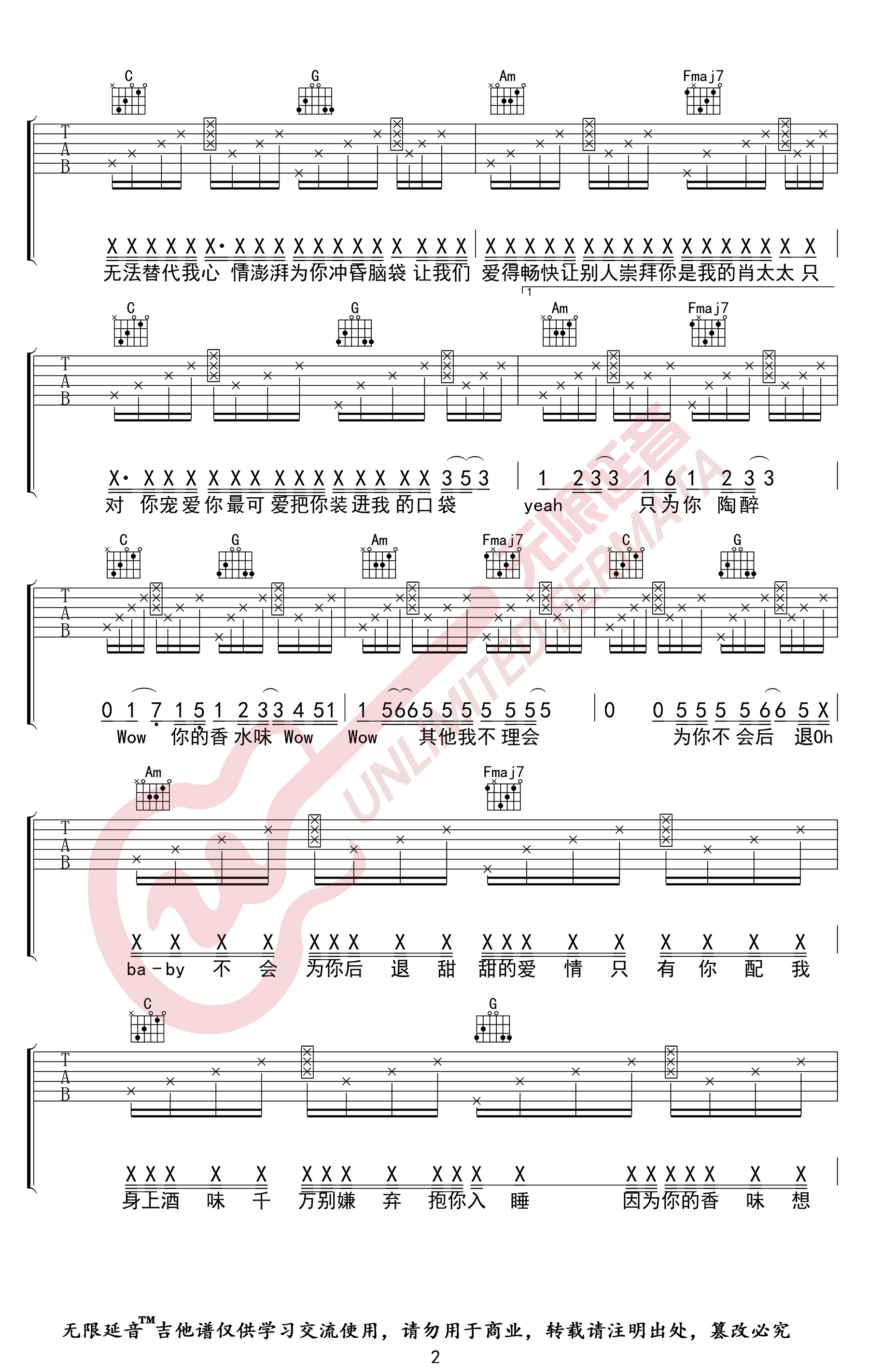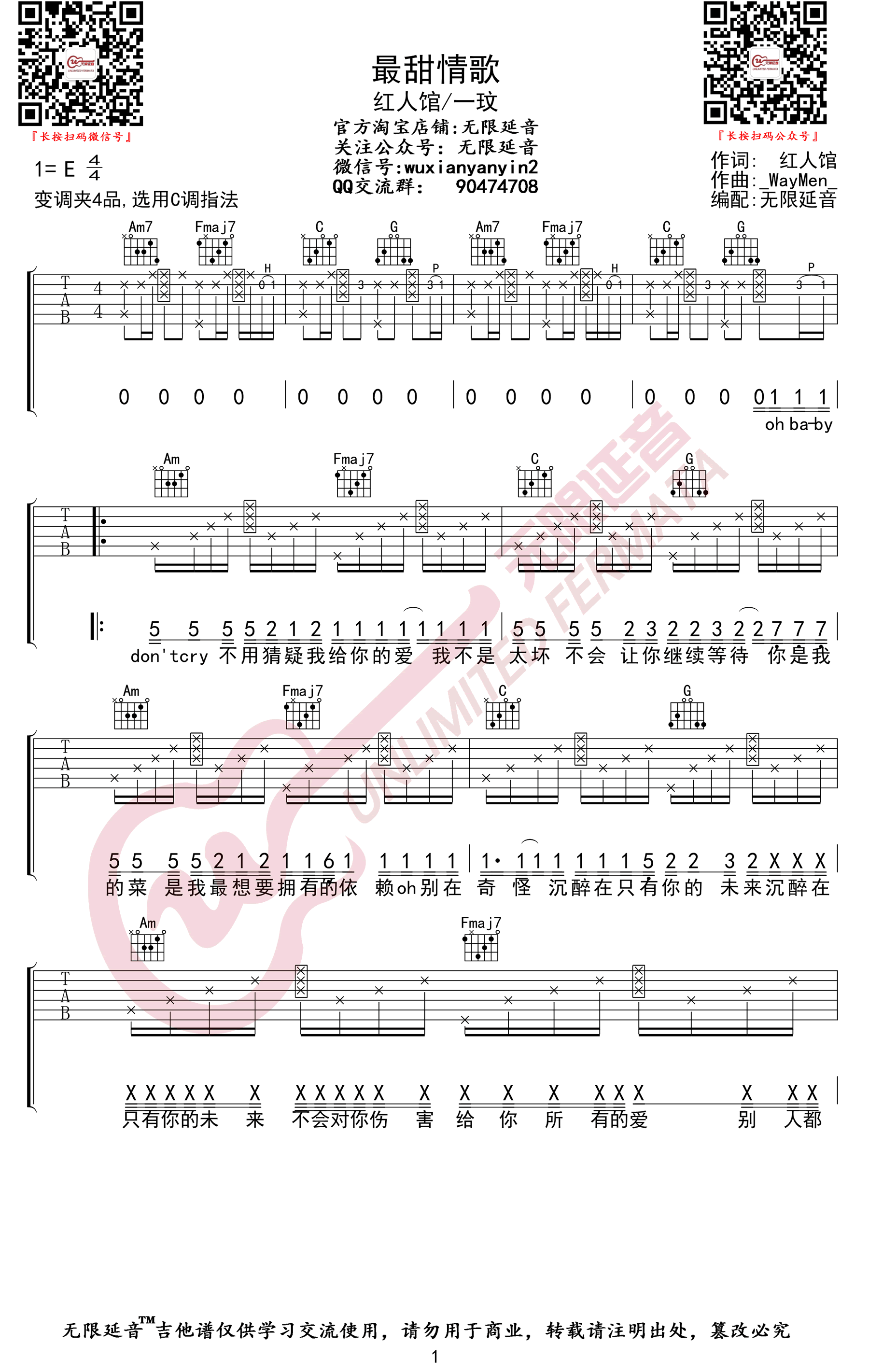 曲谱介绍: 《最甜情歌》吉他谱,红人馆一玟演唱,原调E,变调夹夹四品,选用C调指法。最甜情歌六线谱,三张弹唱图片谱,无限延音编配制谱,整理更新。