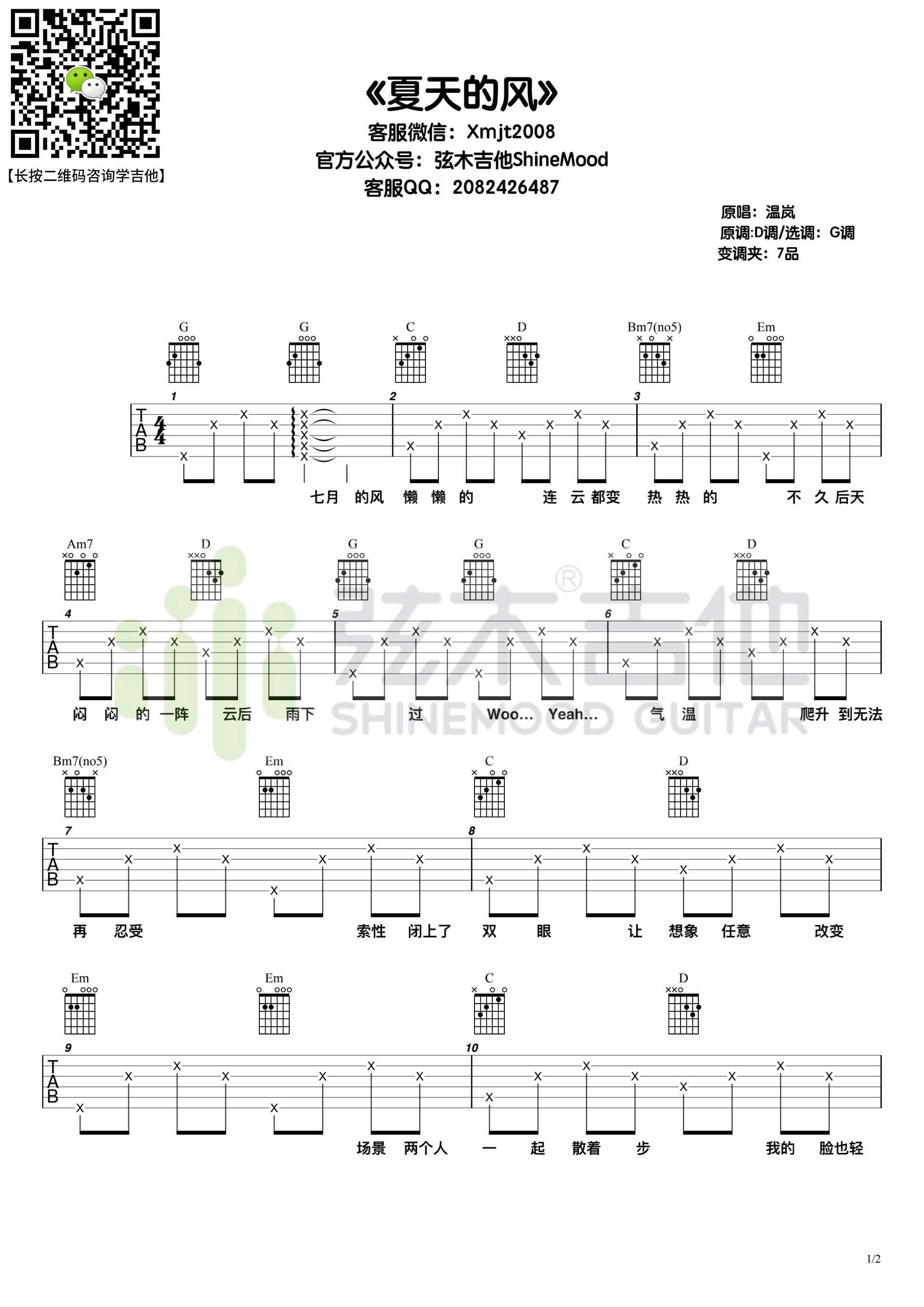 曲谱介绍: 夏天的风吉他谱,温岚演唱,这首歌旋律优美动人,有着明显的周氏情歌的风格,夏天的风六线谱,原调D选调G,变调夹夹七品。弦木吉他编配,更新上传。 日影飞去,流光荏苒,时间倏忽已经人间四月天了。在这个春夏交替的季节,小风儿一吹,催着人们赶紧抓住春天的尾巴,迎接夏天的暖风。温岚甜美又有一点慵懒的嗓音,听起来满是夏天的感觉。