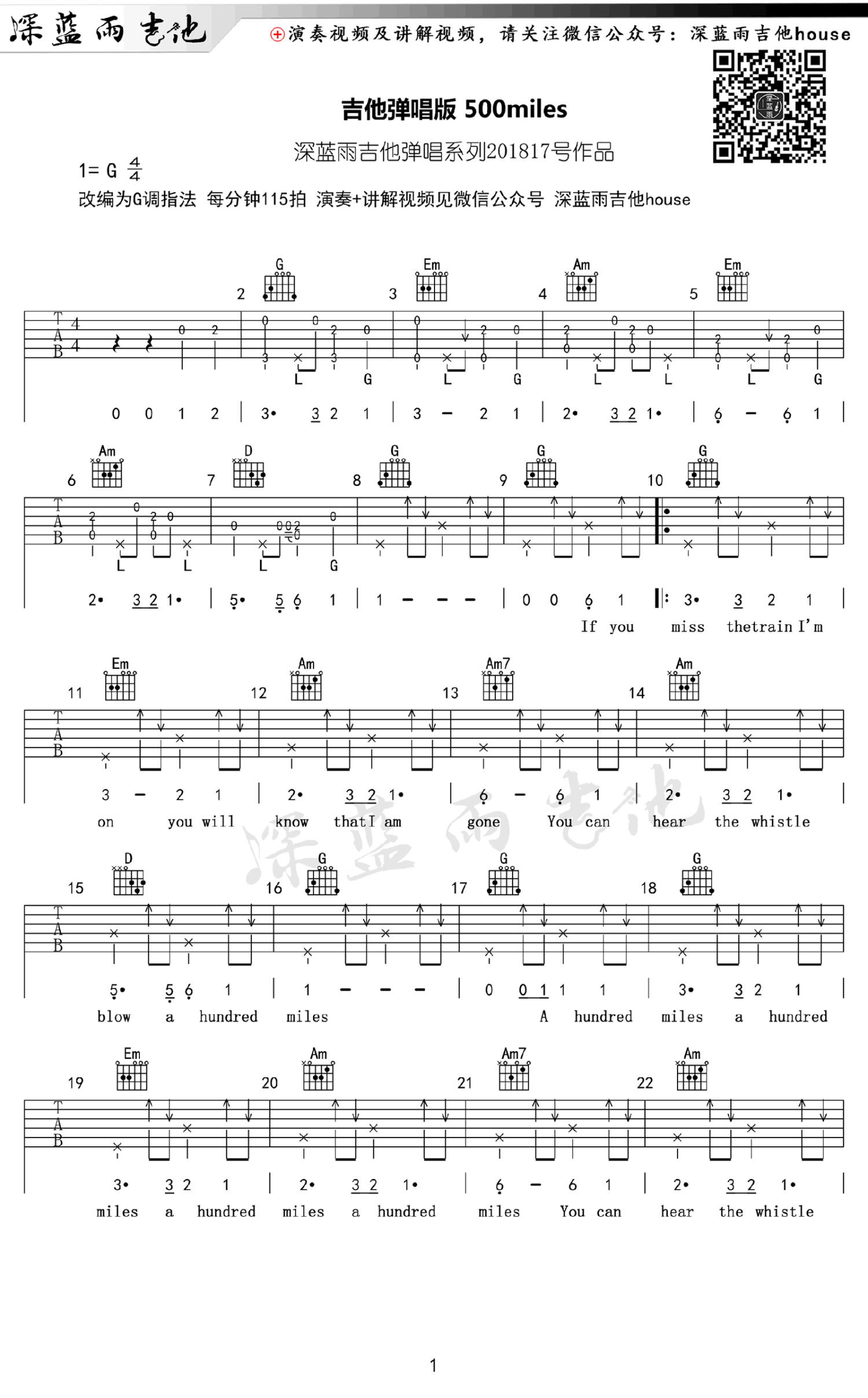 曲谱介绍: 500miles吉他谱,G调指法弹唱谱,每分钟115拍,一首让人单曲循环的经典英文歌曲,《醉乡民谣》深情献唱主题曲。让这首经典老歌重新回荡在我们的脑海心间