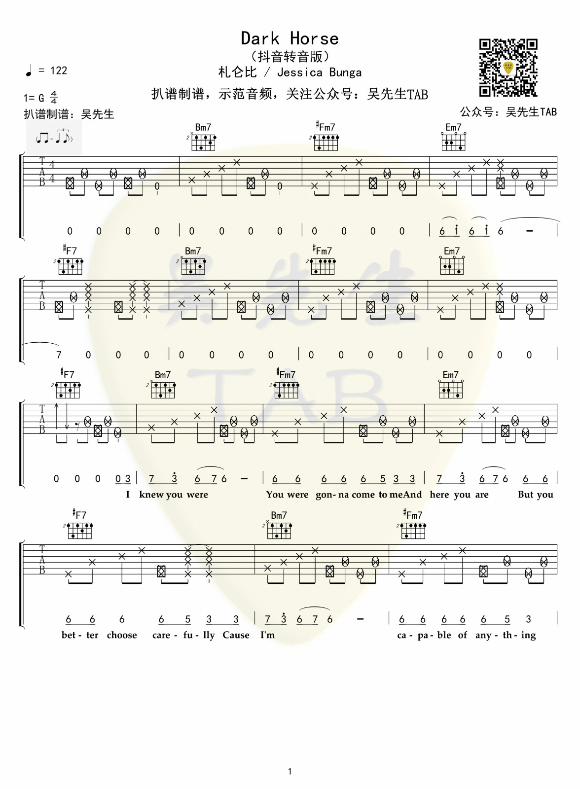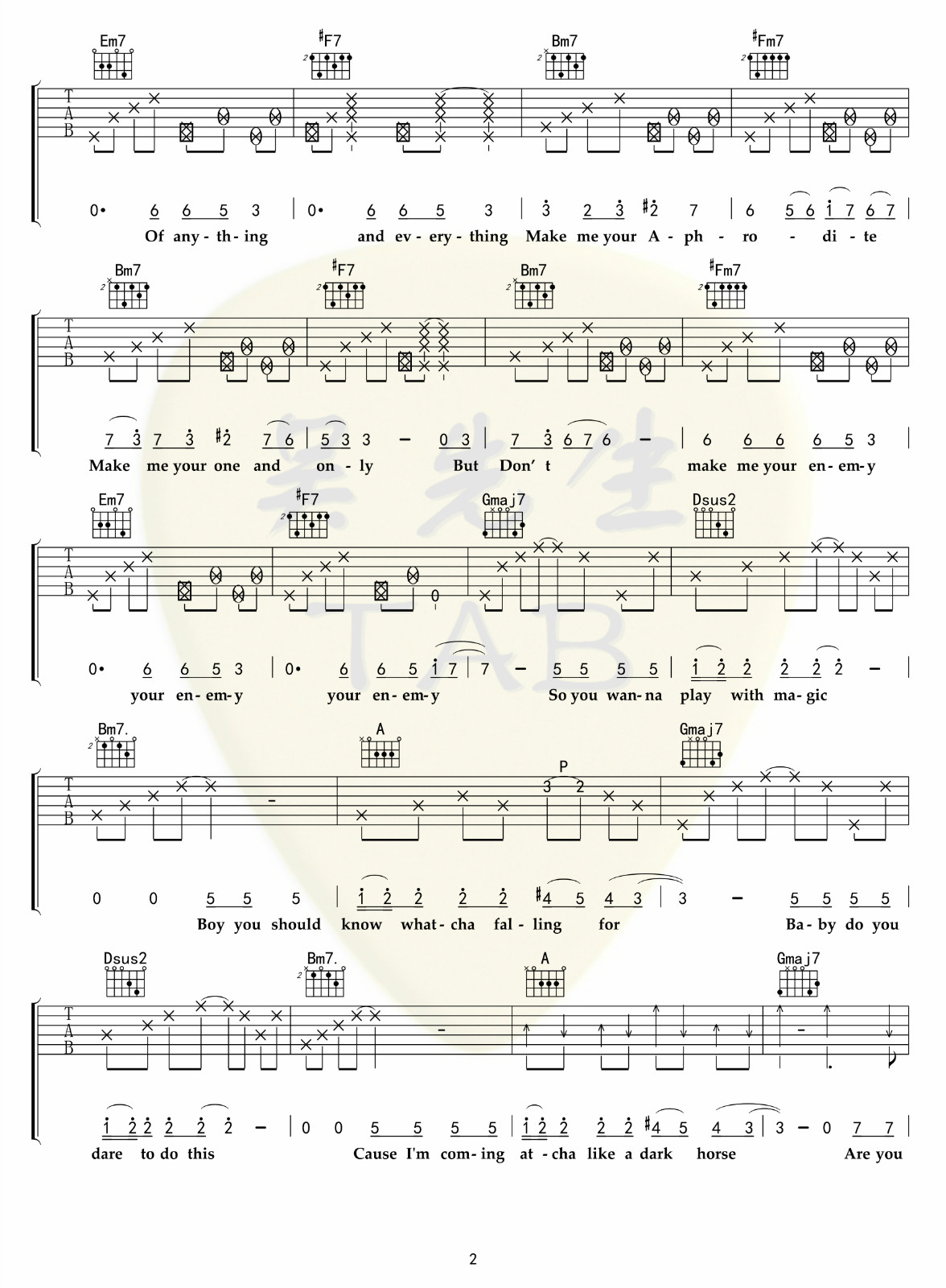 曲谱介绍: Katy《DarkHorse》吉他弹唱谱,共有6张高清图谱。