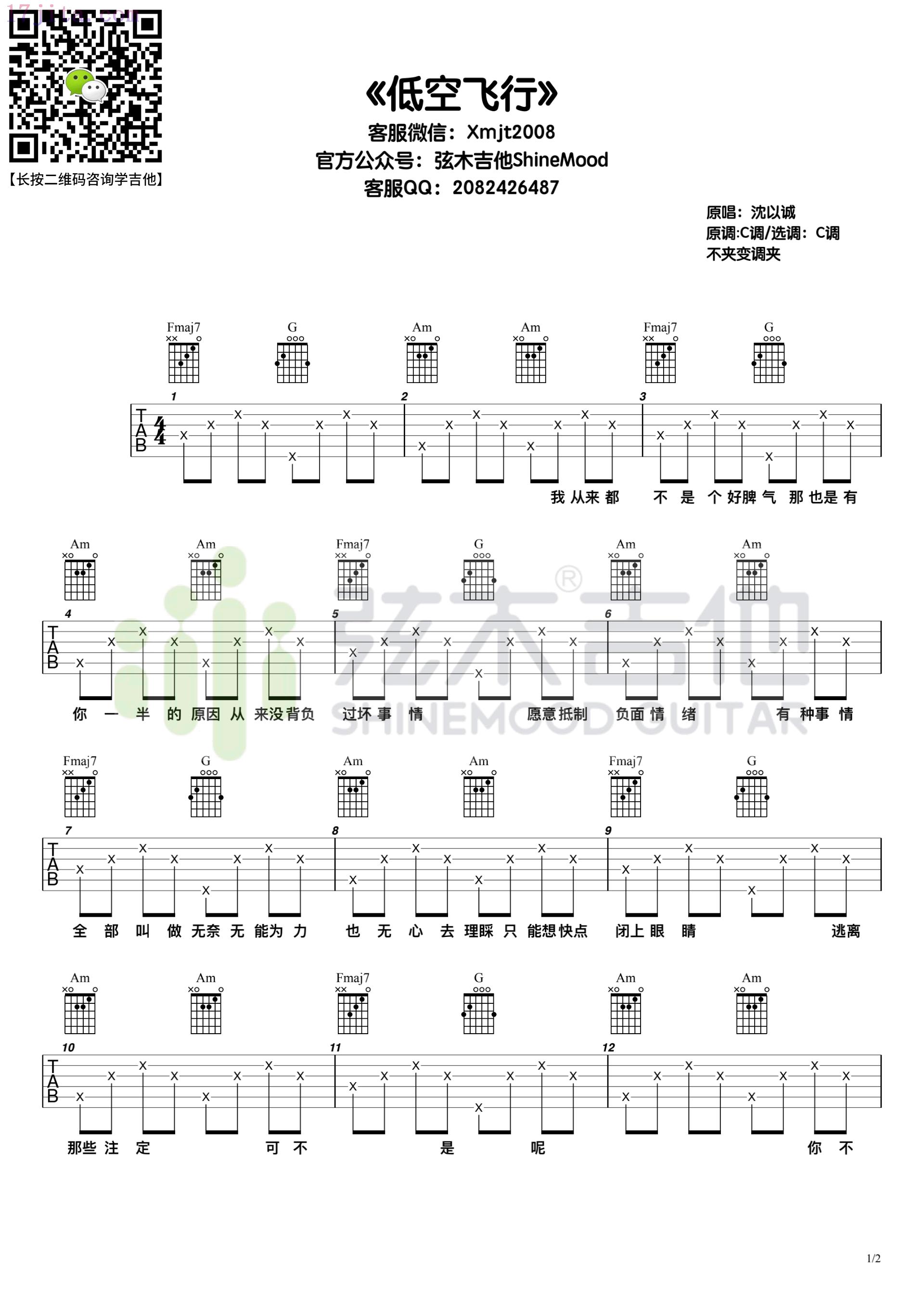曲谱介绍: 《低空飞行》吉他谱,沈以诚演唱,婶婶风靡网络的一首歌曲。C调弹唱谱,低空飞行六线谱,两张高清图片谱例,弦木吉他编配,更新上传。 沈以诚温柔特别的嗓音依旧给人惊喜,清新之中致幻氤氲,在睡梦里指点迷津,告诉我们难过时要学会低空飞行。萦绕在耳边时,又像是一个暖暖的男孩子在诉说,简直让人忍不住心动,男友音真的名副其实了。