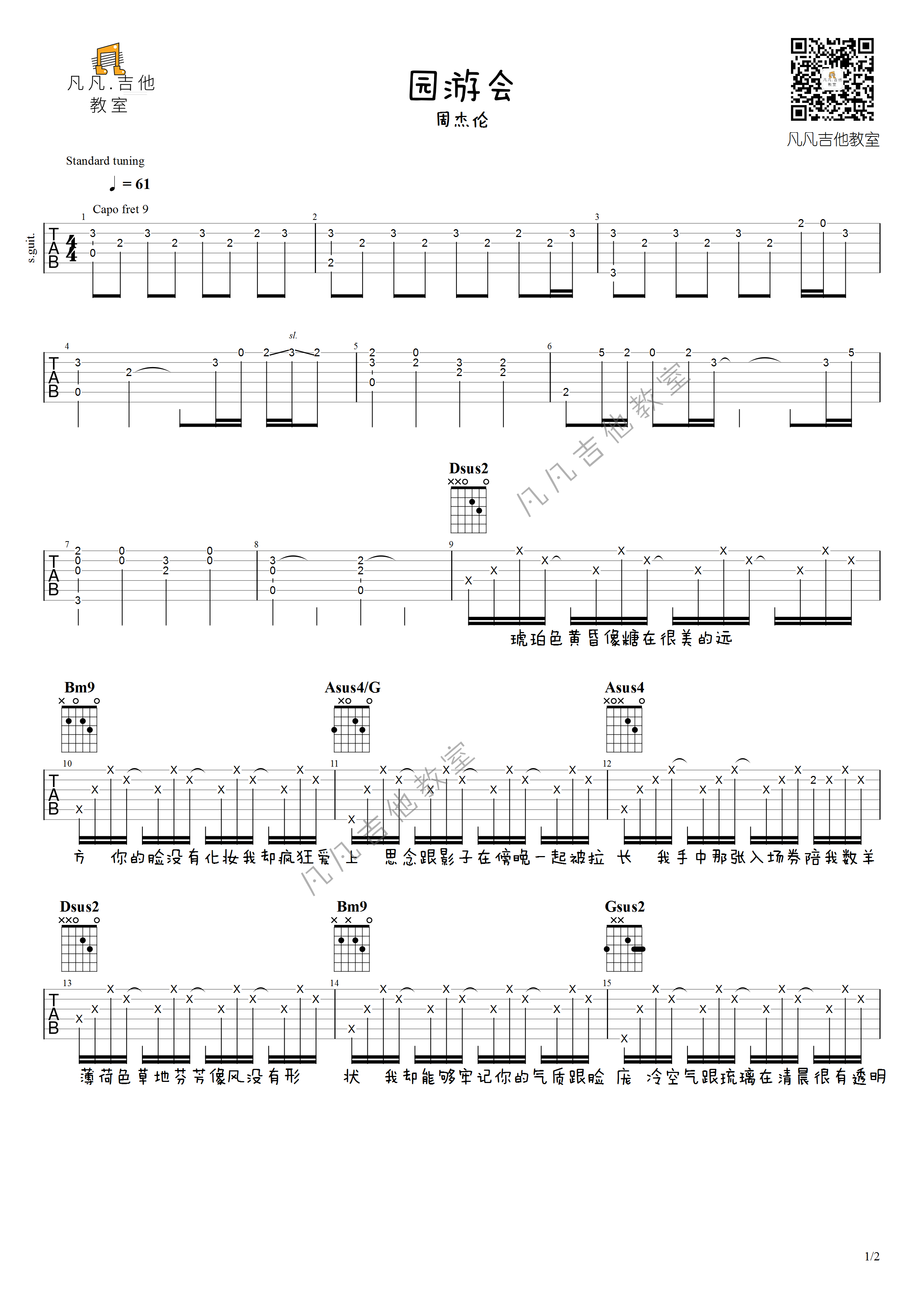 曲谱介绍: 周杰伦《园游会》吉他弹唱谱,共有2张高清图谱,免翻页排版设计。