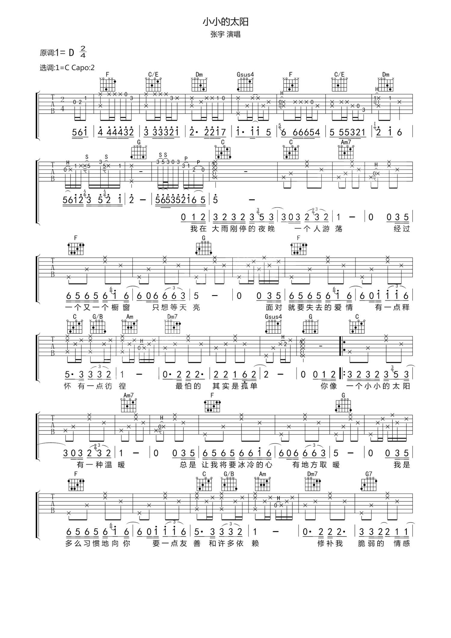曲谱介绍: 张宇《小小的太阳》原调D调,本谱选调C调,变调夹=2品