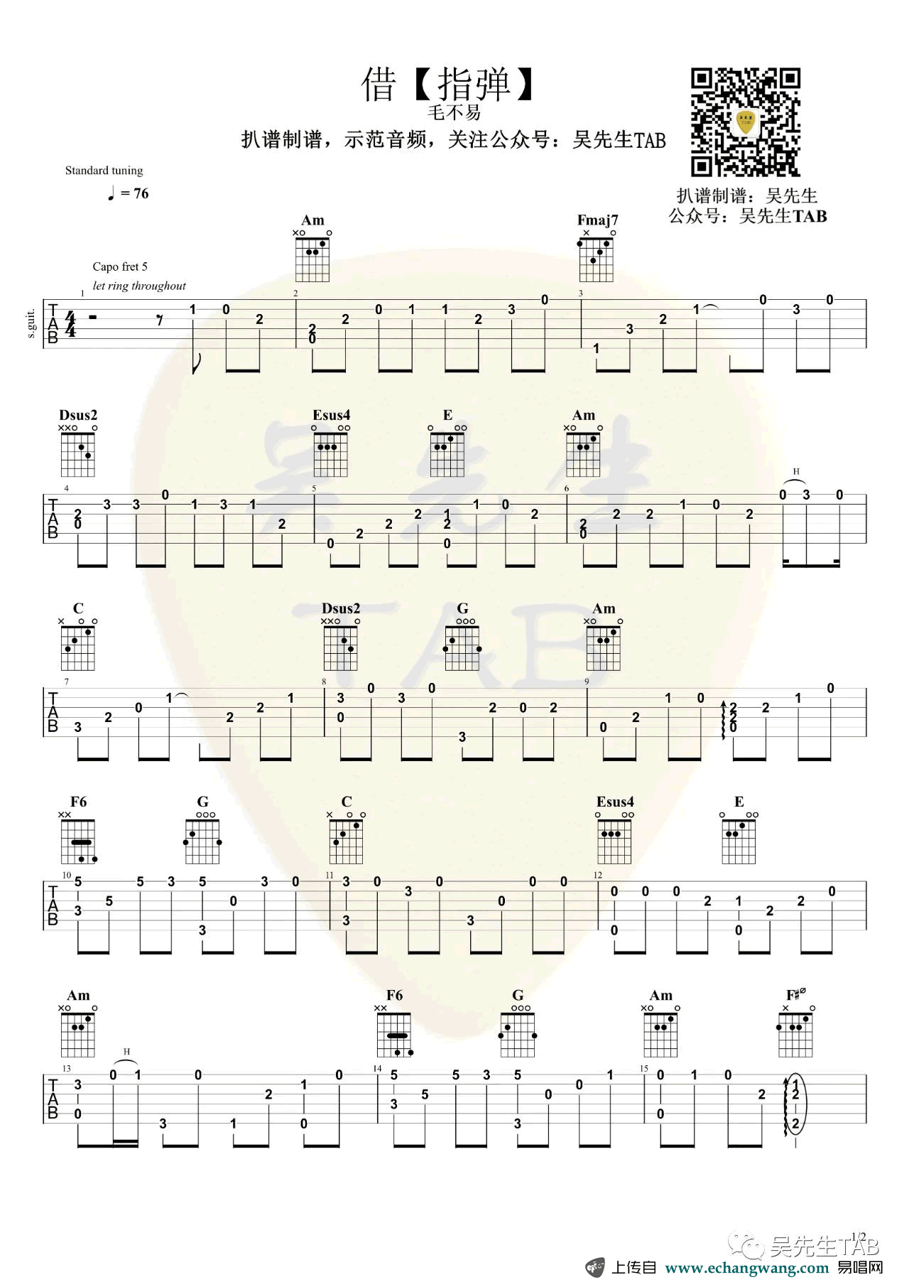 曲谱介绍: 《借》指弹吉他谱,毛不易在明日之子节目中演唱的一首原创歌曲改编,借吉他独奏谱,CAPO夹五品,吴先生tab编配制谱,91吉他谱上传更新。