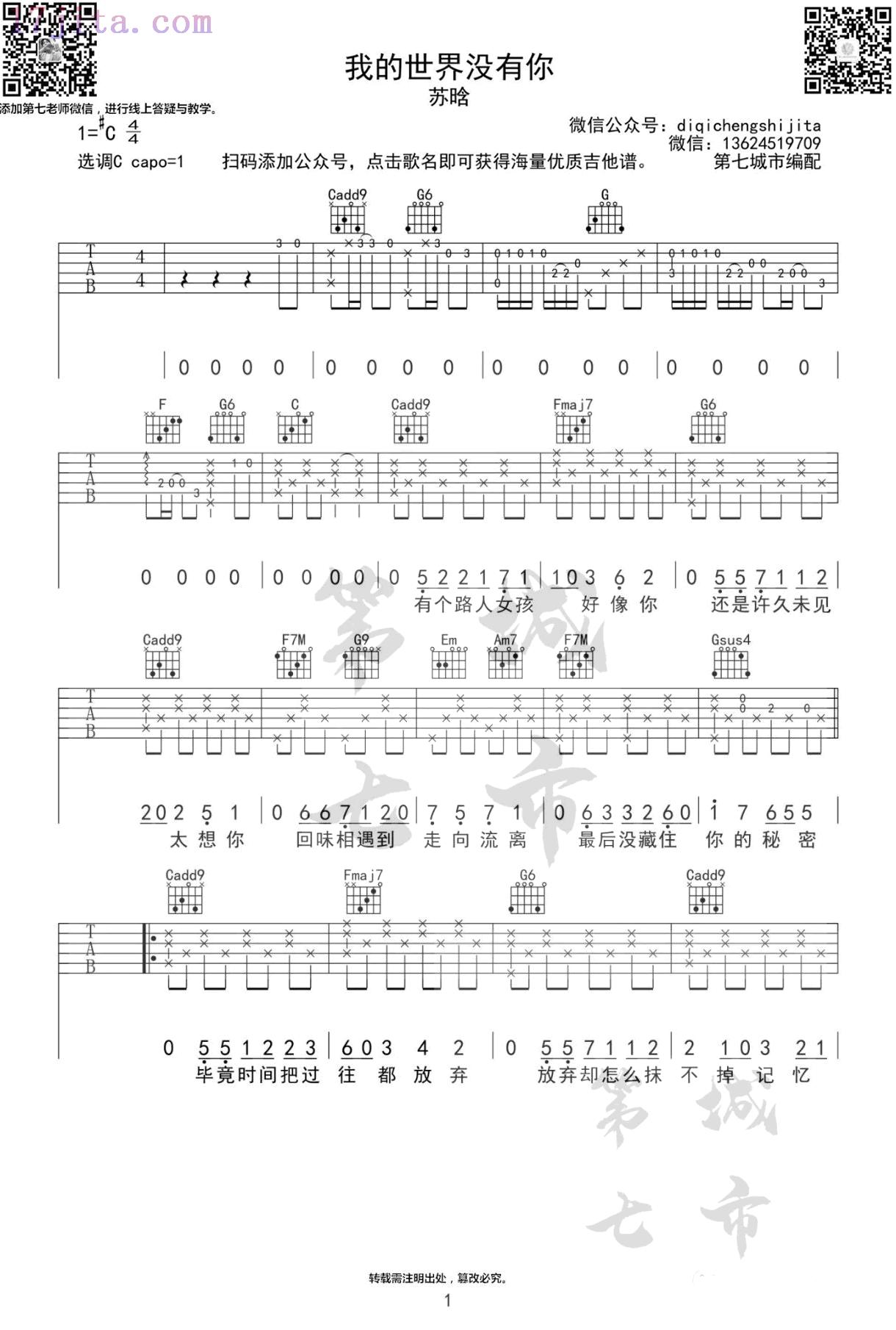 曲谱介绍: 《我的世界没有你》吉他谱,苏晗演唱的一首网络热门歌曲,我的世界没有你六线谱,原调升C选用C调指法,CAPO夹一品,三张图片谱,第七城市编配制谱,上传分享。 清新苏打水般的声线,甜美刻画了那段情怀的每一种情绪,唱出一份青涩的恋爱回忆,而引发自己的所思所念。