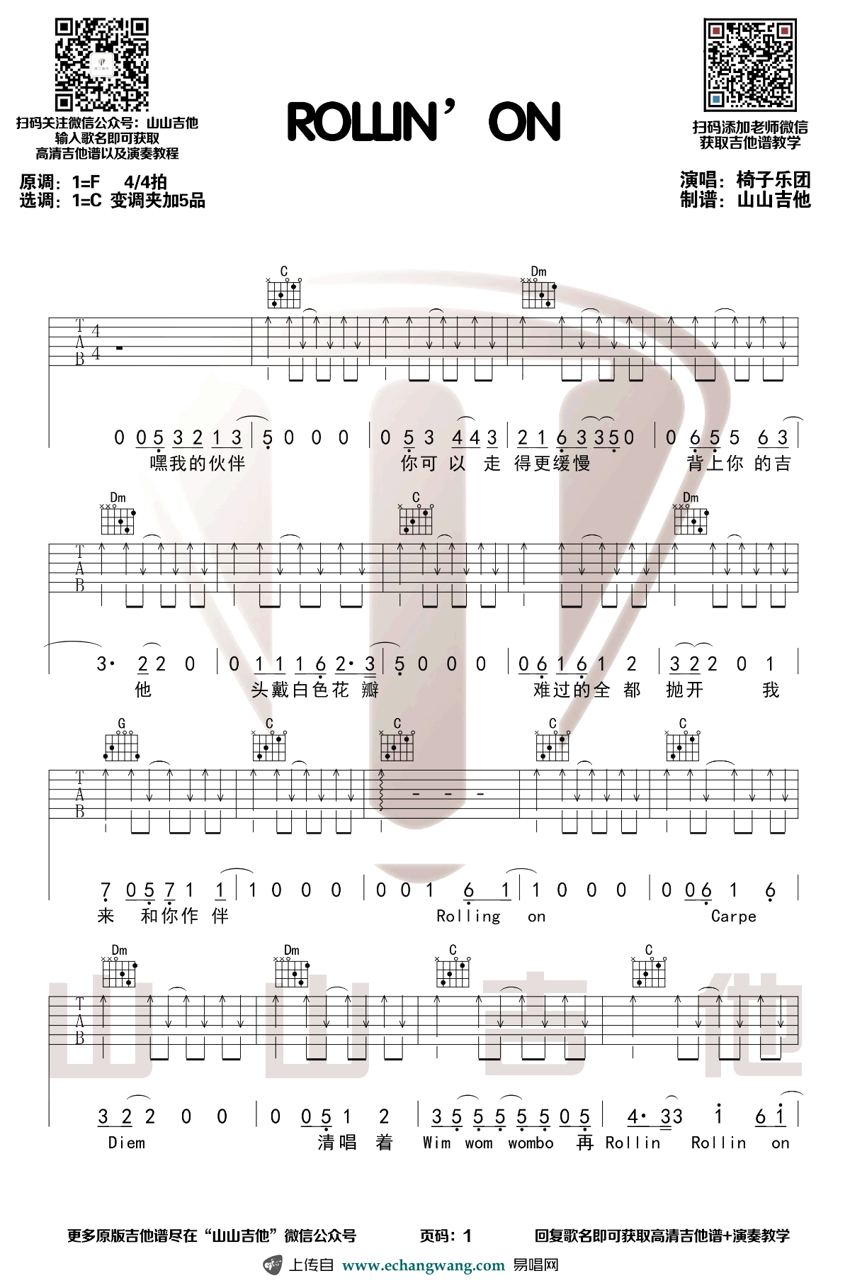 曲谱介绍: 《Rollin'on》吉他谱,椅子乐团在《乐队的夏天》节目中演唱的一首歌曲,Rollin'on六线谱,原调F,选调C,变调夹夹五品。山山吉他编配制谱,琴谱网 网echangwang.com上传更新。 台湾椅子乐团这首《Rollin'on》充满了温暖气息,让人可以安静的坐下来听,其实这首歌曲的和弦走向也编配的非常巧妙,山山老师为大家录制了这首歌曲的演示视频,喜欢这首歌的朋友可以拿着吉他谱练起来啦~