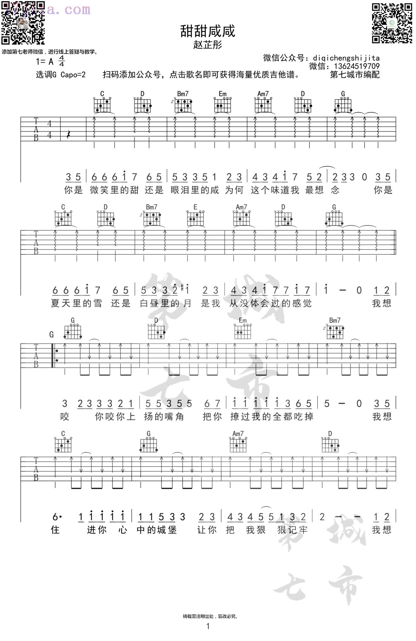 曲谱介绍: 《甜甜咸咸》吉他谱,赵芷彤演唱,甜甜咸咸吉他弹唱谱,原调A选调G,capo夹二品,两张图片六线谱,第七城市编配,整理分享。 一首抖音热门歌曲,干净稚嫩的歌声,仿佛初春的清风,带着无邪的童真和青草的芬芳气息,糖分真的超足 。