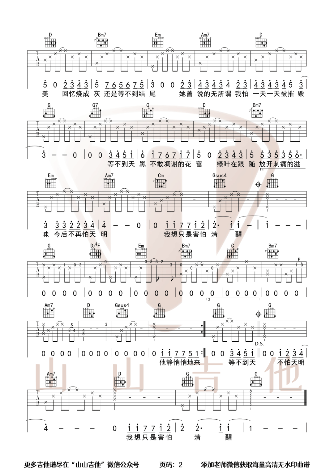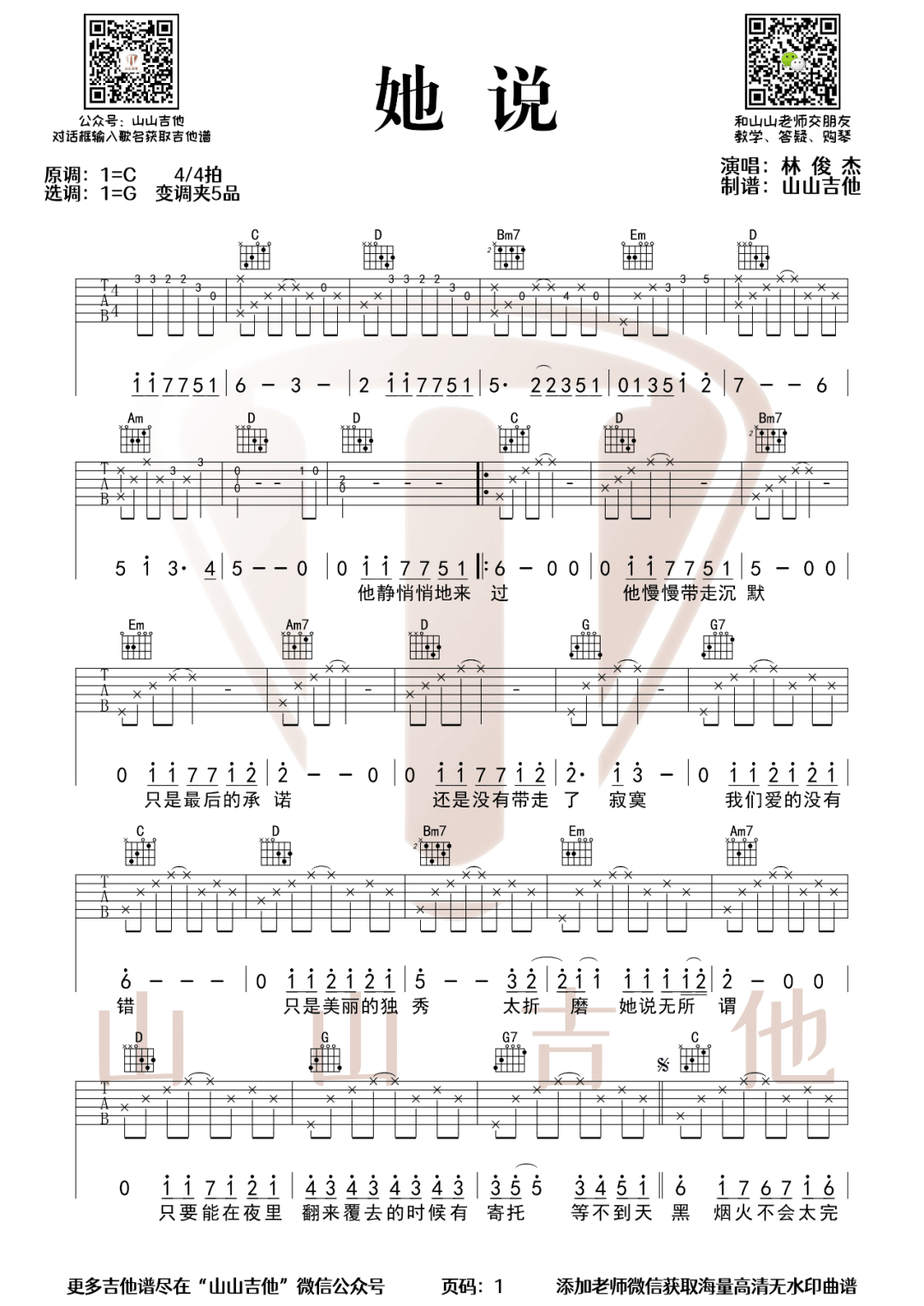 曲谱介绍: 吉他谱介绍:她说吉他谱,林俊杰演唱的一首歌曲,4/4拍的节奏,这首歌曲的原调为C调,这里曲谱采用了G调指法进行编配,演唱时夹变调夹5品可回到原调,也可根据个人实际嗓音情况选择。曲谱由琴谱网更新上传,共2张高清图片弹唱吉他谱例,来源于@山山吉他编配出品。这首歌曲散发出来的寂寥与哀伤更胜过唯美的印象,从旋律、歌词和林俊杰的歌声的结合,让这首歌表现得更为的具有画面感。