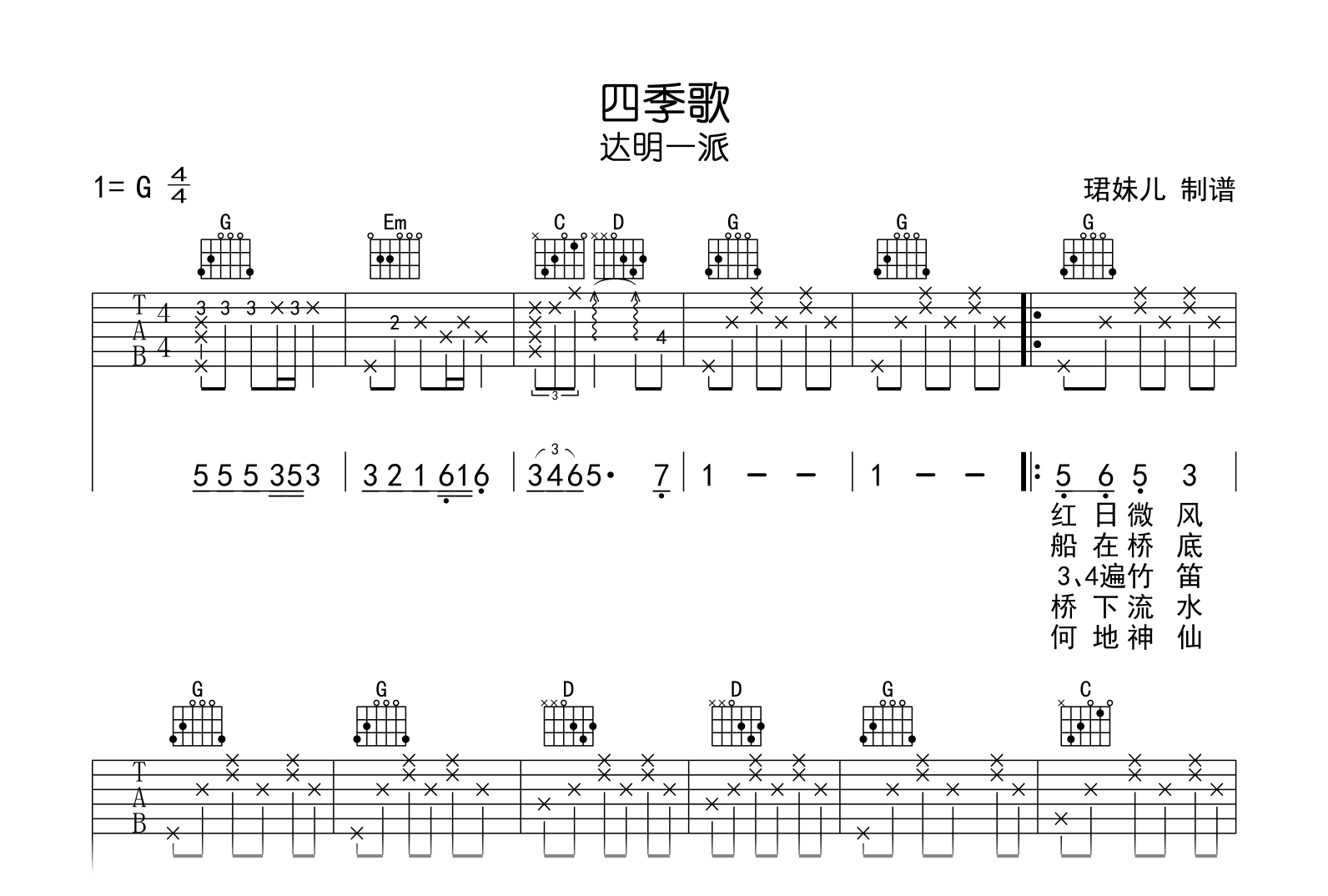 曲谱介绍: 四季歌吉他谱,达明一派演唱,一首经典粤语歌曲。《四季歌》吉他弹唱谱,选用G调指法编配,速度80BPM,演奏难度较简单易上手,高清图片谱共两张谱例。