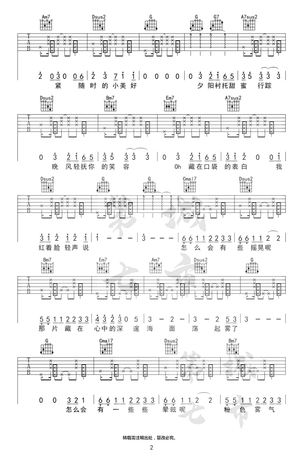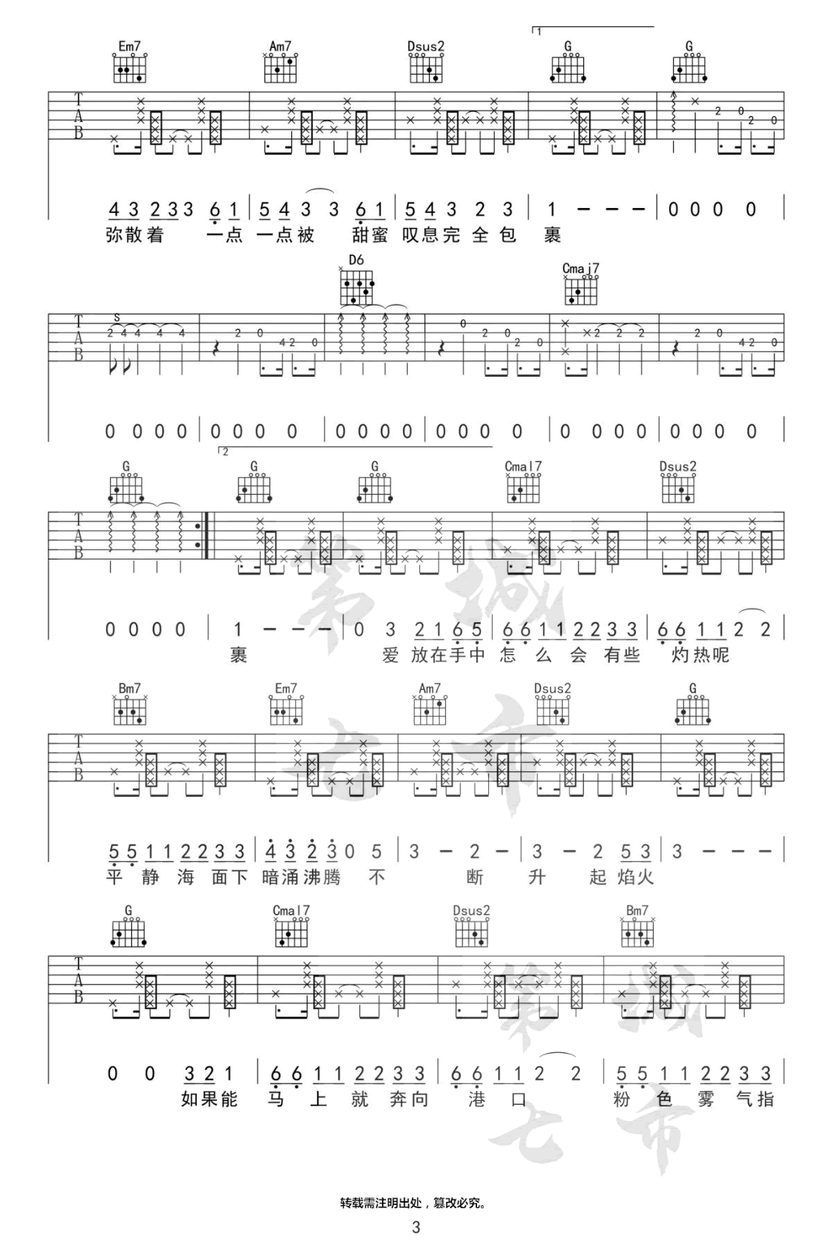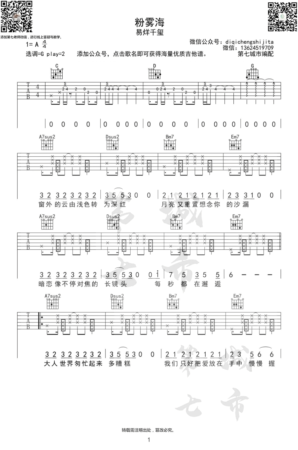 曲谱介绍: 《粉雾海》吉他谱,易烊千玺的一首梦幻唯美的新歌单曲,粉雾海六线谱,原调A选用G调指法,变调夹夹第二品,完整版共四张图片谱。第七城市编配出品,91吉他谱www.echangwang.com整理上传。 千玺慵懒呢喃式的歌声,吟唱出少年忐忑而甜蜜的心情。简单坚定,就像每一个成长的我们,内心始终保留着一份美好,就仿佛那片梦幻的粉雾海,是我们在现实世界里的Neverland。