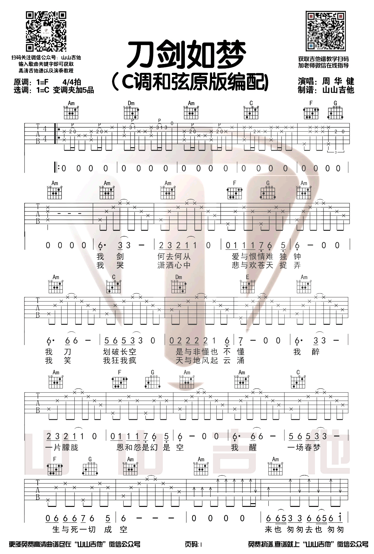 曲谱介绍: 周华健《刀剑如梦》吉他谱,电视剧《倚天屠龙记》主题曲,刀剑如梦六线谱,原调F,选用C调和弦原版编配,弹唱图片谱共三张谱例。山山吉他制谱出品,琴谱网吉他谱网更新上传。 副歌部分“来也匆匆,去也匆匆,恨不能相逢”讲出了一代侠客的江湖生活,这首极具江湖气息的歌曲得到了众多金庸迷的喜爱。吉他谱编有原版前奏,难度适中,适合进阶练习。