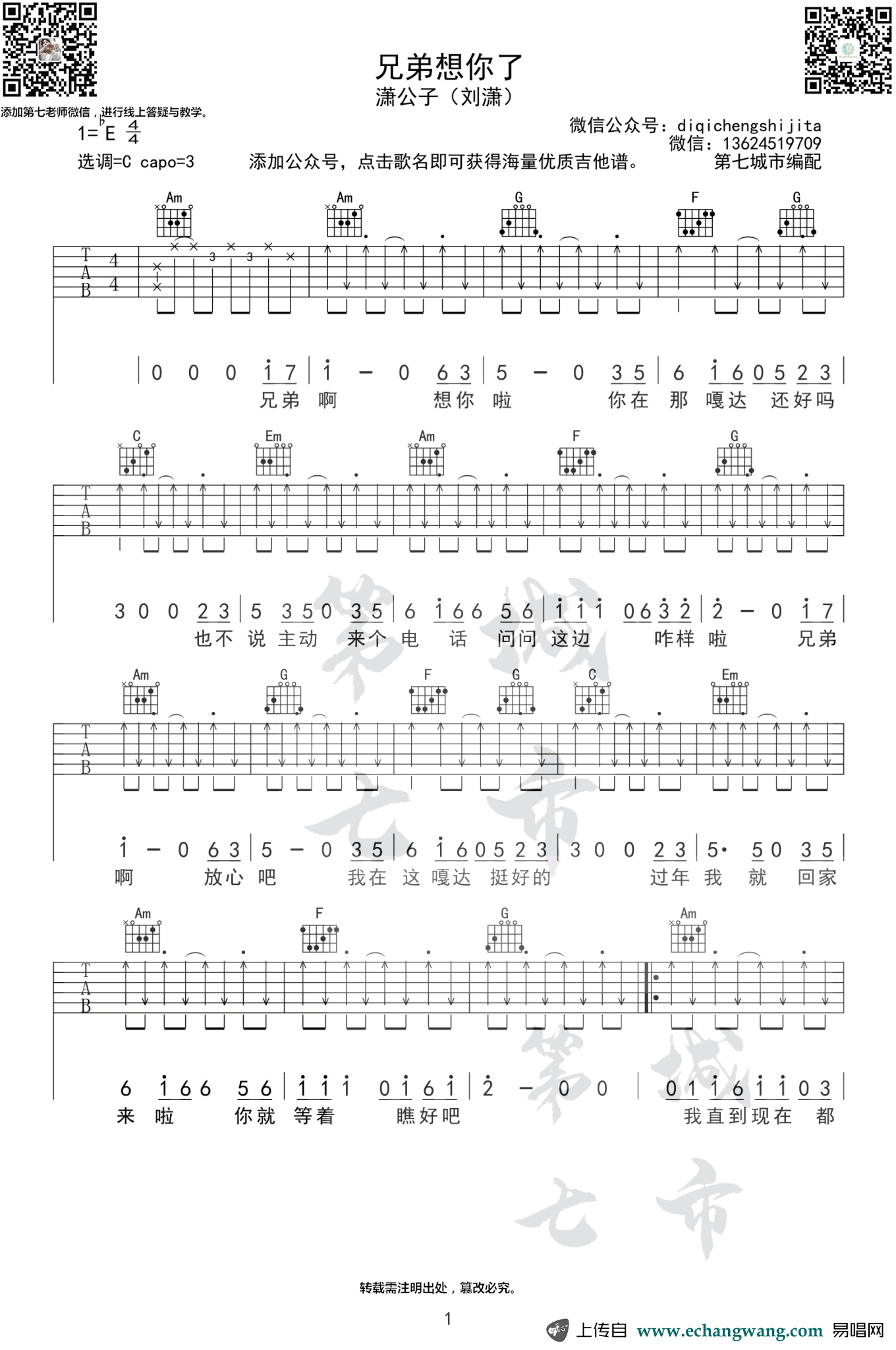 兄弟想你了吉他谱 - 潇公子 - 吉他弹唱谱
