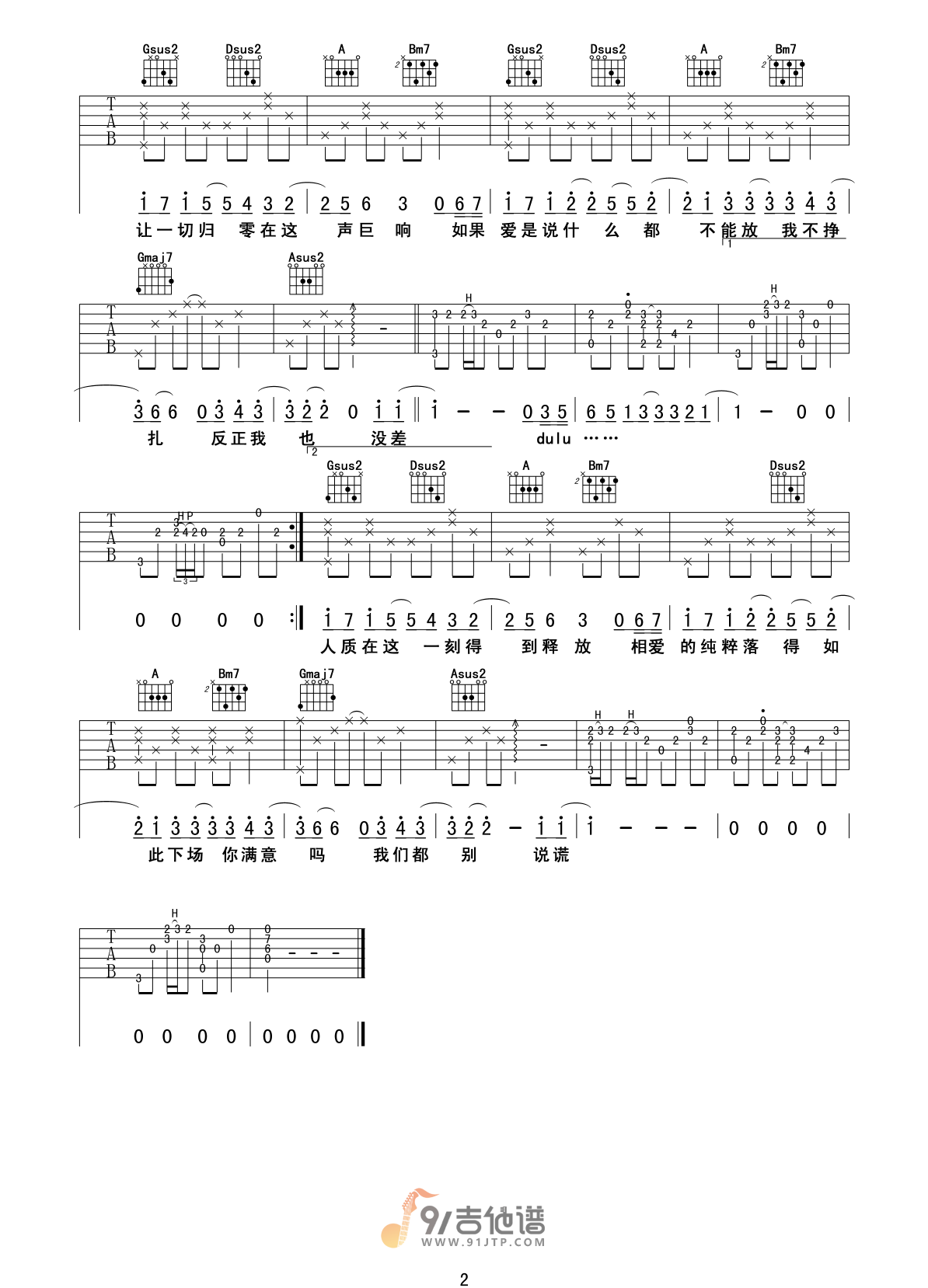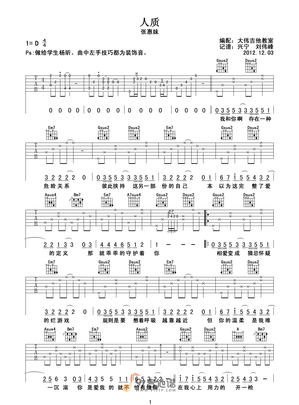 曲谱介绍: 曲谱简介:人质吉他谱,张惠妹演唱的一首歌曲,4/4拍的节奏,这首歌曲的原调为降A调,这里曲谱采用了D调指法进行编配,演唱时夹变调夹6品可回到原调,也可根据个人实际嗓音情况选择。曲谱由大伟吉他教室编配出品。这首歌有很多翻唱版本,但还有原唱张惠妹的版本最为经典。