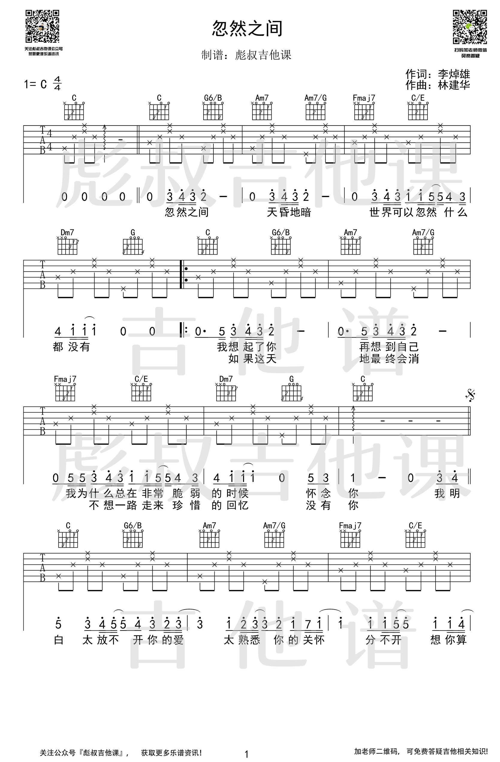 曲谱介绍: 《忽然之间》吉他谱,莫文蔚演唱的一首经典代表歌曲,忽然之间六线谱,C调编配,两张弹唱图片谱。彪叔吉他课制谱出品,琴谱网 网整理更新。 这首歌是为台湾9.21地震创作的公益歌曲,表达了人们对情感的珍惜和感恩,质朴温暖。歌曲翻唱版本很多,其中徐佳莹的声线清澈甜美,有一种缓缓道来的感觉。