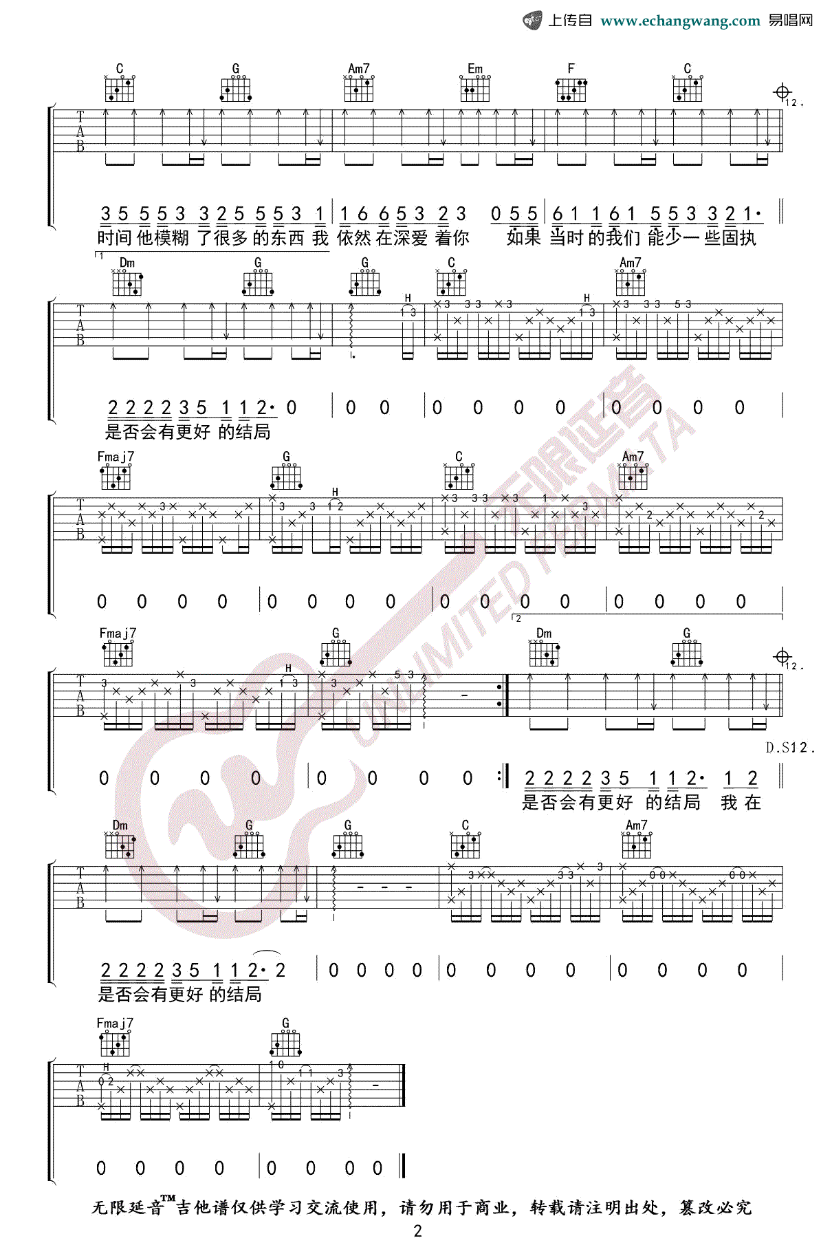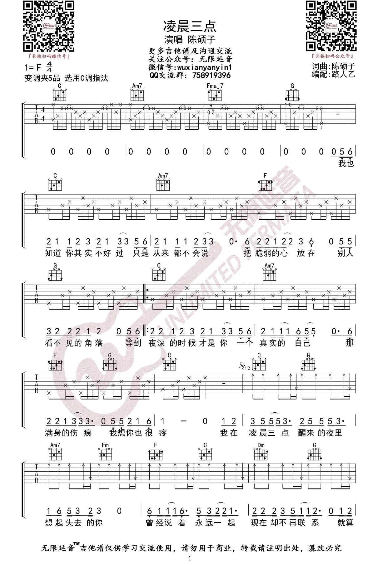 曲谱介绍: 陈硕子《凌晨三点》吉他谱,原调F,变调夹5品,选用C调指法。凌晨三点六线谱,两张弹唱图片谱例,无限延音制谱分享,吉他网更新上传。