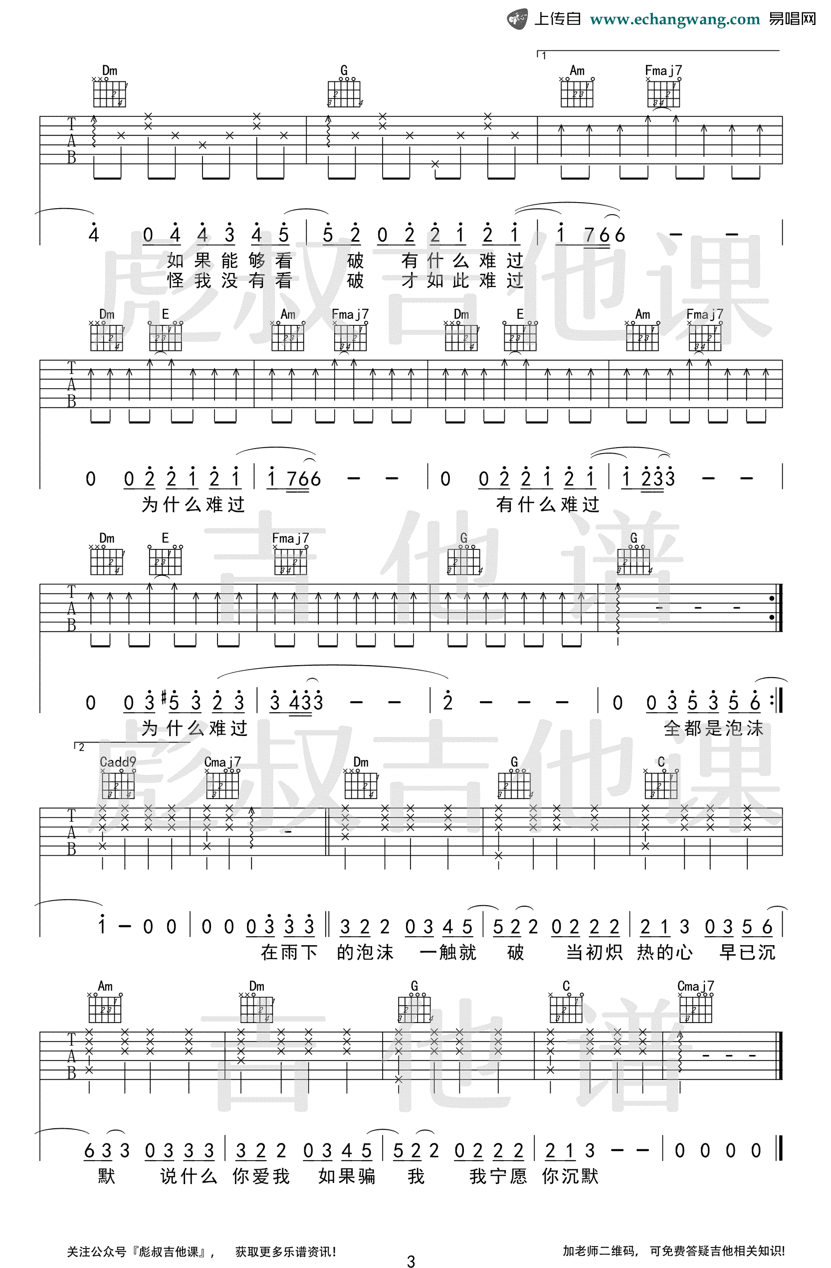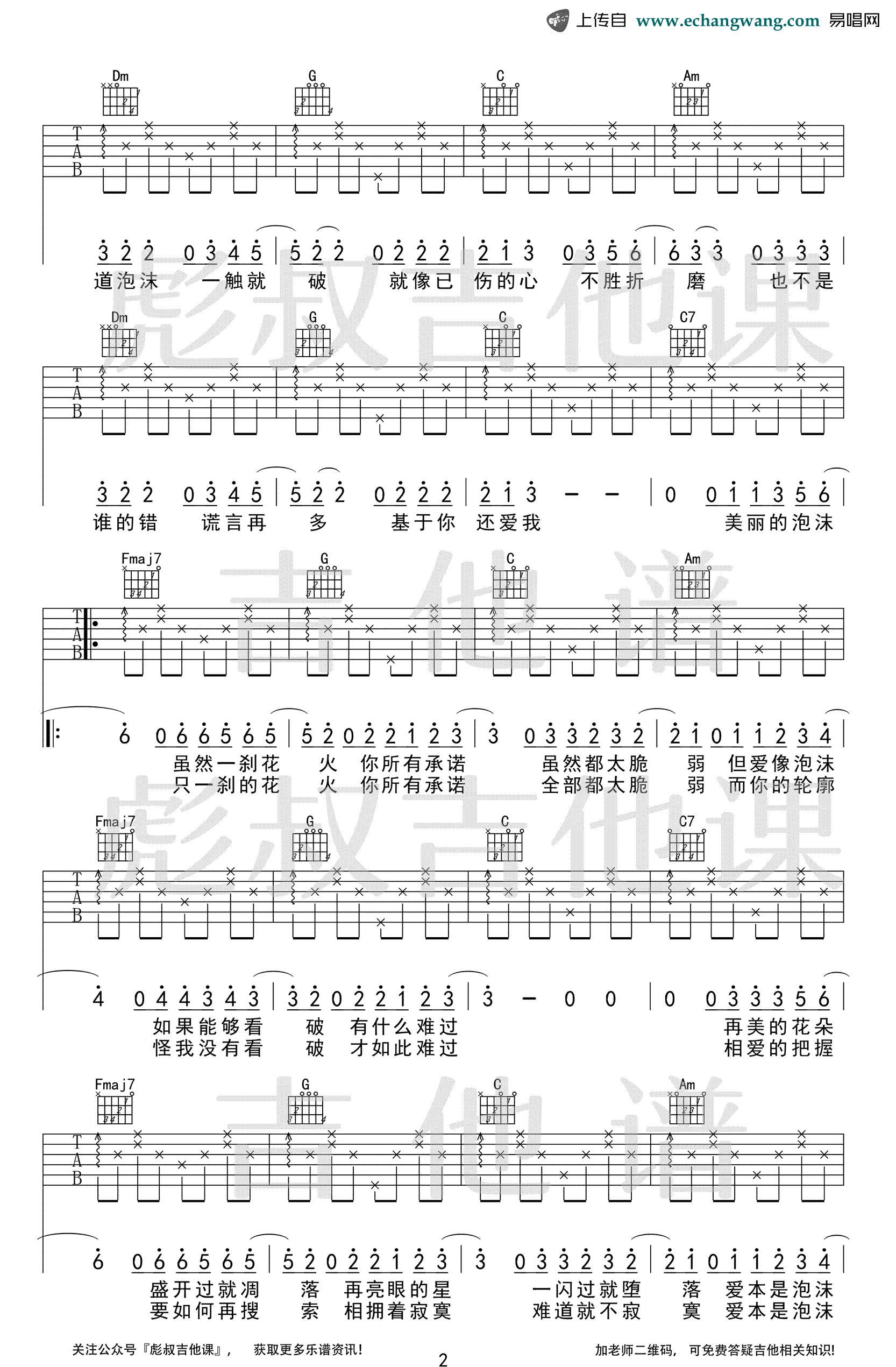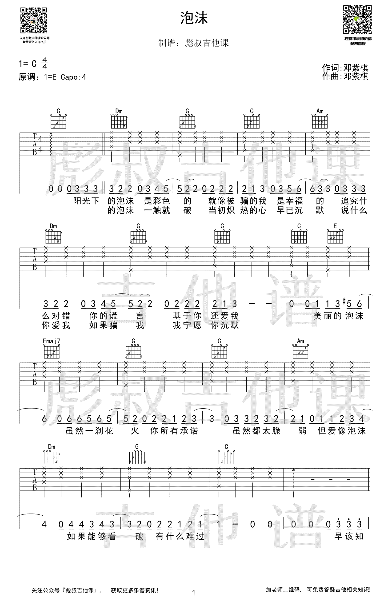 曲谱介绍: 《泡沫》吉他谱,邓紫棋演唱的一首代表歌曲,原调E选调C,Capo夹四品。泡沫六线谱,高清弹唱图片谱共三张谱例。彪叔吉他课编配出品,琴谱网吉他谱网更新上传。 当年一首伤感情歌《泡沫》让人记住了这位金鱼女孩邓紫棋,浸透着落寞回忆的旋律、每一个音符都能唤醒我们内心的那段美丽却易碎的情感。闭上双眼,让我们沉浸在歌声里,弹出属于自己的忧伤和美好。
