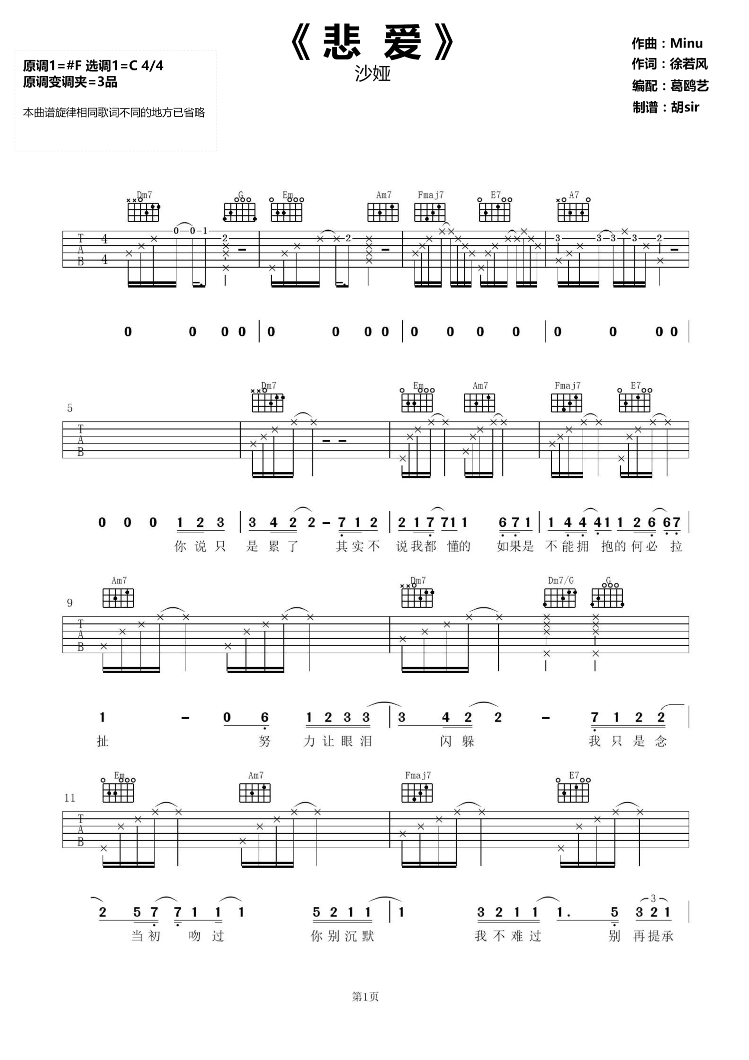 曲谱介绍: 《悲爱》沙娅吉他谱原调升F调,变调夹=3品;本谱选调C调,